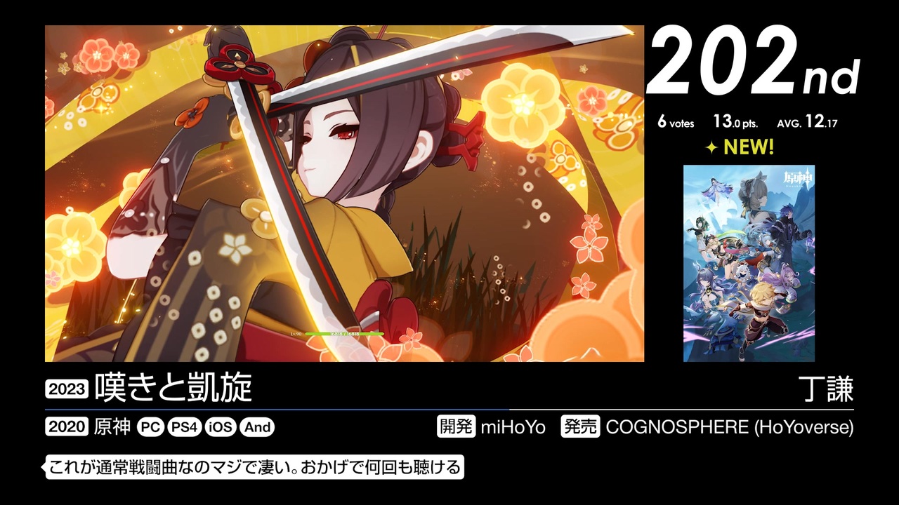 225位~201位の25曲を収録。<br><br>2024年6月11日~2024年8月1日で行われた「第17回みんなで決めるゲーム音楽ベスト100」の投票結果動画です。集計人≠動画制作者<br>♭VI→♭VII→I は俗に「マリオ進行」と呼ばれているので理論に興味ある人はぜひ調べてみてね<br><br><a href="https://www.nicovideo.jp/watch/sm45918229" class="watch">sm45918229</a>←前 次→来週<br><a href="https://www.nicovideo.jp/mylist/78315745" target="_blank" rel="noopener">mylist/78315745</a> <a href="https://www.nicovideo.jp/series/523562" target="_blank" rel="noopener">series/523562</a><br><br>225位 <a href="#" class="seekTime" data-seekTime="0:40" onclick="seekNicoPlayer('#0:40'); return false;">#0:40</a> / 224位 <a href="#" class="seekTime" data-seekTime="7:02" onclick="seekNicoPlayer('#7:02'); return false;">#7:02</a> / 223位 <a href="#" class="seekTime" data-seekTime="8:43" onclick="seekNicoPlayer('#8:43'); return false;">#8:43</a> / 221位 <a href="#" class="seekTime" data-seekTime="12:21" onclick="seekNicoPlayer('#12:21'); return false;">#12:21</a>, <a href="#" class="seekTime" data-seekTime="14:17" onclick="seekNicoPlayer('#14:17'); return false;">#14:17</a> / 220位 <a href="#" class="seekTime" data-seekTime="19:25" onclick="seekNicoPlayer('#19:25'); return false;">#19:25</a> / 219位 <a href="#" class="seekTime" data-seekTime="26:45" onclick="seekNicoPlayer('#26:45'); return false;">#26:45</a> / 218位 <a href="#" class="seekTime" data-seekTime="29:58" onclick="seekNicoPlayer('#29:58'); return false;">#29:58</a> / 217位 <a href="#" class="seekTime" data-seekTime="34:28" onclick="seekNicoPlayer('#34:28'); return false;">#34:28</a> / 216位 <a href="#" class="seekTime" data-seekTime="36:25" onclick="seekNicoPlayer('#36:25'); return false;">#36:25</a> / 215位 <a href="#" class="seekTime" data-seekTime="42:18" onclick="seekNicoPlayer('#42:18'); return false;">#42:18</a> / 214位 <a href="#" class="seekTime" data-seekTime="46:43" onclick="seekNicoPlayer('#46:43'); return false;">#46:43</a> / 213位 <a href="#" class="seekTime" data-seekTime="48:34" onclick="seekNicoPlayer('#48:34'); return false;">#48:34</a> / 212位 <a href="#" class="seekTime" data-seekTime="51:22" onclick="seekNicoPlayer('#51:22'); return false;">#51:22</a> / 211位 <a href="#" class="seekTime" data-seekTime="52:53" onclick="seekNicoPlayer('#52:53'); return false;">#52:53</a> / 210位 <a href="#" class="seekTime" data-seekTime="56:07" onclick="seekNicoPlayer('#56:07'); return false;">#56:07</a> / 209位 <a href="#" class="seekTime" data-seekTime="58:12" onclick="seekNicoPlayer('#58:12'); return false;">#58:12</a> / 208位 <a href="#" class="seekTime" data-seekTime="62:18" onclick="seekNicoPlayer('#62:18'); return false;">#62:18</a> / 206位 <a href="#" class="seekTime" data-seekTime="66:46" onclick="seekNicoPlayer('#66:46'); return false;">#66:46</a>, <a href="#" class="seekTime" data-seekTime="70:08" onclick="seekNicoPlayer('#70:08'); return false;">#70:08</a> / 205位 <a href="#" class="seekTime" data-seekTime="73:17" onclick="seekNicoPlayer('#73:17'); return false;">#73:17</a> / 204位 <a href="#" class="seekTime" data-seekTime="77:28" onclick="seekNicoPlayer('#77:28'); return false;">#77:28</a> / 202位 <a href="#" class="seekTime" data-seekTime="79:51" onclick="seekNicoPlayer('#79:51'); return false;">#79:51</a>, <a href="#" class="seekTime" data-seekTime="84:22" onclick="seekNicoPlayer('#84:22'); return false;">#84:22</a> / 201位 <a href="#" class="seekTime" data-seekTime="88:22" onclick="seekNicoPlayer('#88:22'); return false;">#88:22</a><br><br>----------<br><br>スクリーンショット募集中!詳細はこちら↓<br><a href="https://gamemusic17.vercel.app/" target="_blank" rel="noopener nofollow">https://gamemusic17.vercel.app/</a><br><br>結果詳細↓<br><a href="https://w.atwiki.jp/gamemusicbest100/pages/10538.html" target="_blank" rel="noopener nofollow">https://w.atwiki.jp/gamemusicbest100/pages/10538.html</a><br /><br>----------<br><br>第2回みんなで決める和風曲ランキング 2/28まで投票受付中!<br><a href="https://jbbs.shitaraba.net/bbs/read.cgi/music/25545/1764514793/" target="_blank" rel="noopener nofollow">https://jbbs.shitaraba.net/bbs/read.cgi/music/25545/1764514793/</a><br><br>みんなで決める2025年の新曲ゲーム音楽ランキング 3/31まで投票受付中!<br><a href="https://jbbs.shitaraba.net/bbs/read.cgi/music/25545/1769870472/" target="_blank" rel="noopener nofollow">https://jbbs.shitaraba.net/bbs/read.cgi/music/25545/1769870472/</a>