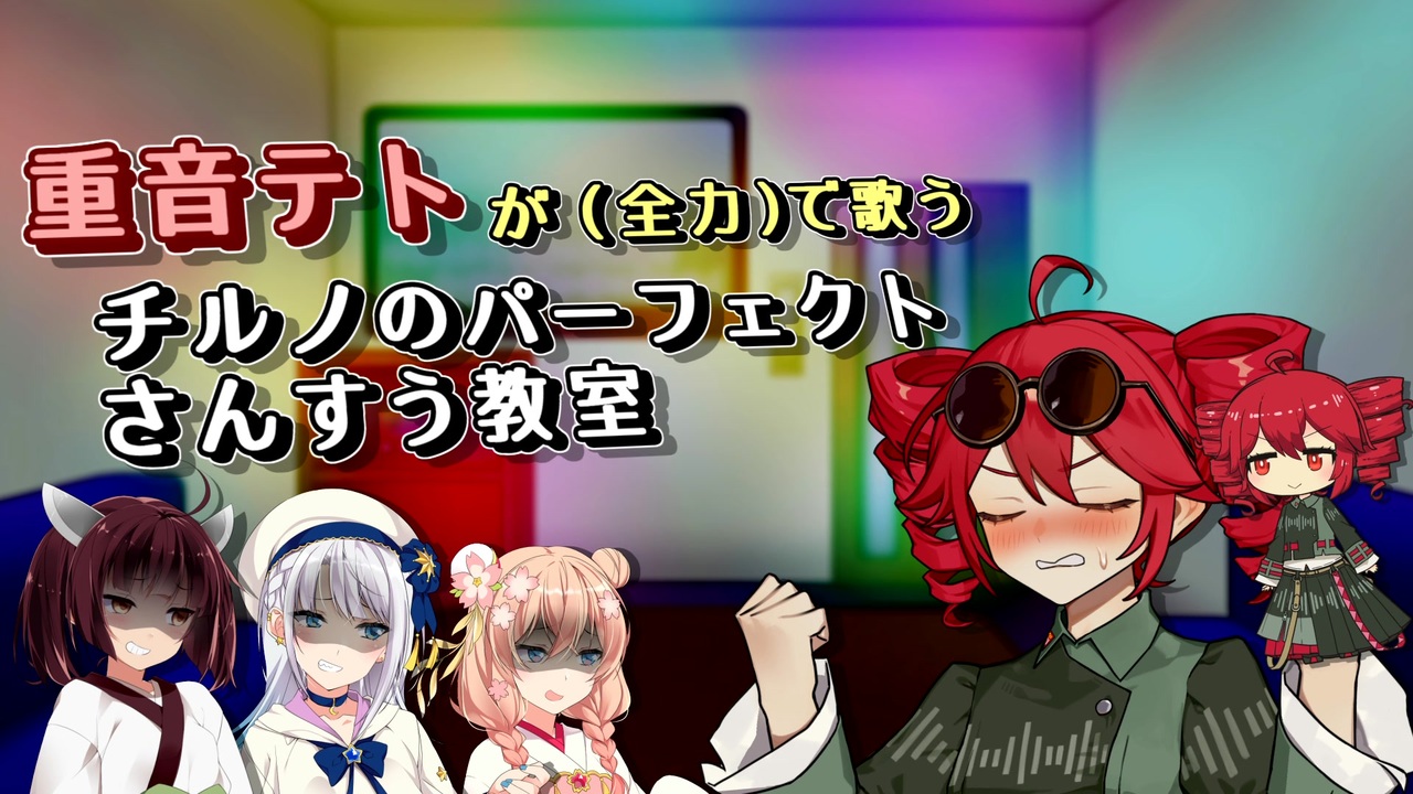 どうも、カバー18曲目になります…これも一度作ってみたかった!<br>中学生くらいの頃に知ってドはまりした曲です…推しの一人であるチルノも好き<br>フルバージョンではなくお馴染みの方ですね。<br><br>セリフや⑨コールのテンポも、出来る限り本家様に合わせてみました<br>ハモリは耳コピなので合ってるか分からない! <br><br>▼追記<br>誤字を修正しました<br><br>▼本家様<br><a href="https://www.youtube.com/watch?v=V_bQNPG2OyE&list=RDV_bQNPG2OyE&start_radio=1" target="_blank" rel="noopener nofollow">https://www.youtube.com/watch?v=V_bQNPG2OyE&list=RDV_bQNPG2OyE&start_radio=1</a><br>▼お借りした音源<br><a href="https://www.youtube.com/watch?v=3Jwpy7LP7Zg&list=RD3Jwpy7LP7Zg&start_radio=1" target="_blank" rel="noopener nofollow">https://www.youtube.com/watch?v=3Jwpy7LP7Zg&list=RD3Jwpy7LP7Zg&start_radio=1</a><br><br>▼調声<br>アカザクラ<br><br>▼ボーカル、⑨コール<br>・重音テト (SynthesizerV_AI)<br>・彩澄しゅお (VOICEPEAK)<br>・彩澄りりせ (VOICEPEAK)<br>・東北きりたん (VOICEPEAK)<br><br>▼お借りした素材<br>・重音テト (@君臨徳雷克(ドレイク) 様):<a href="https://seiga.nicovideo.jp/seiga/im11601257" target="_blank" rel="noopener">im11601257</a><br>・重音テト (akihiyo 様):<a href="https://seiga.nicovideo.jp/seiga/im11745635" target="_blank" rel="noopener">im11745635</a><br>・彩澄しゅお (MtU 様):<a href="https://seiga.nicovideo.jp/seiga/im11087416" target="_blank" rel="noopener">im11087416</a><br>・彩澄りりせ (MtU 様):<a href="https://seiga.nicovideo.jp/seiga/im11087416" target="_blank" rel="noopener">im11087416</a><br>・東北きりたん (MtU 様):<a href="https://seiga.nicovideo.jp/seiga/im10144087" target="_blank" rel="noopener">im10144087</a><br><br>▼ソフト<br>SynthesizerV Studio Basic<br>VOICEPEAK<br>Aviutil<br><br>▼その他クレジット<br>楽曲:チルノのパーフェクトさんすう教室<br>作詞:夕野ヨシミ<br>作曲:ARM<br>原曲:おてんば恋娘<br><br><a target="_blank" href="https://qa.nicovideo.jp/faq/show/19424?site_domain=default" style="font-size: 13px;color: #657586; text-decoration: underline; line-height: 1.4">この動画は投稿者によって修正されました</a>