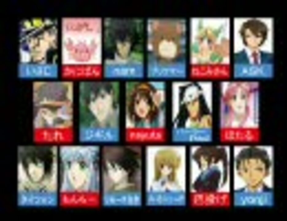 初投稿です。とりあえず自分のやりたいようにやってみましたニコニコできたなら幸いです。【歌い手様一覧】■いさじ(<a href="https://www.nicovideo.jp/watch/sm3568184" class="watch">sm3568184</a>)■かにぱん(<a href="https://www.nicovideo.jp/watch/sm3616564" class="watch">sm3616564</a>)■nam(<a href="https://www.nicovideo.jp/watch/sm3132926" class="watch">sm3132926</a>)■プリクマー(<a href="https://www.nicovideo.jp/watch/sm3074634" class="watch">sm3074634</a>)■ねこみさん(<a href="https://www.nicovideo.jp/watch/sm3756966" class="watch">sm3756966</a>)■ASK(<a href="https://www.nicovideo.jp/watch/sm4288502" class="watch">sm4288502</a>)■たれ(<a href="https://www.nicovideo.jp/watch/sm3452378" class="watch">sm3452378</a>)■ジギル(<a href="https://www.nicovideo.jp/watch/sm3728941" class="watch">sm3728941</a>)■nayuta(<a href="https://www.nicovideo.jp/watch/sm3333000" class="watch">sm3333000</a>)■パーラー『Me』(<a href="https://www.nicovideo.jp/watch/sm3029085" class="watch">sm3029085</a>)■ほたる(<a href="https://www.nicovideo.jp/watch/sm3850461" class="watch">sm3850461</a>)■タイツォン(<a href="https://www.nicovideo.jp/watch/sm3256896" class="watch">sm3256896</a>)■もんちー(<a href="https://www.nicovideo.jp/watch/sm3511892" class="watch">sm3511892</a>)リモーネ先生(<a href="https://www.nicovideo.jp/watch/sm3054860" class="watch">sm3054860</a>)■みるにぃ♂(<a href="https://www.nicovideo.jp/watch/sm3588456" class="watch">sm3588456</a>)■巴投げ(<a href="https://www.nicovideo.jp/watch/sm4020311" class="watch">sm4020311</a>)■yonji(<a href="https://www.nicovideo.jp/watch/sm3299246" class="watch">sm3299246</a>)少しでもこの動画を楽しんでもらうため、覚醒システム、ゲストシステムを搭載しました。黄色で表示されている人(ゲスト)は歌いません。11/3.修正版うpしました⇒(<a href="https://www.nicovideo.jp/watch/sm5134254" class="watch">sm5134254</a>)今まで作ったの⇒<a href="https://www.nicovideo.jp/mylist/9122499" target="_blank" rel="noopener">mylist/9122499</a>
