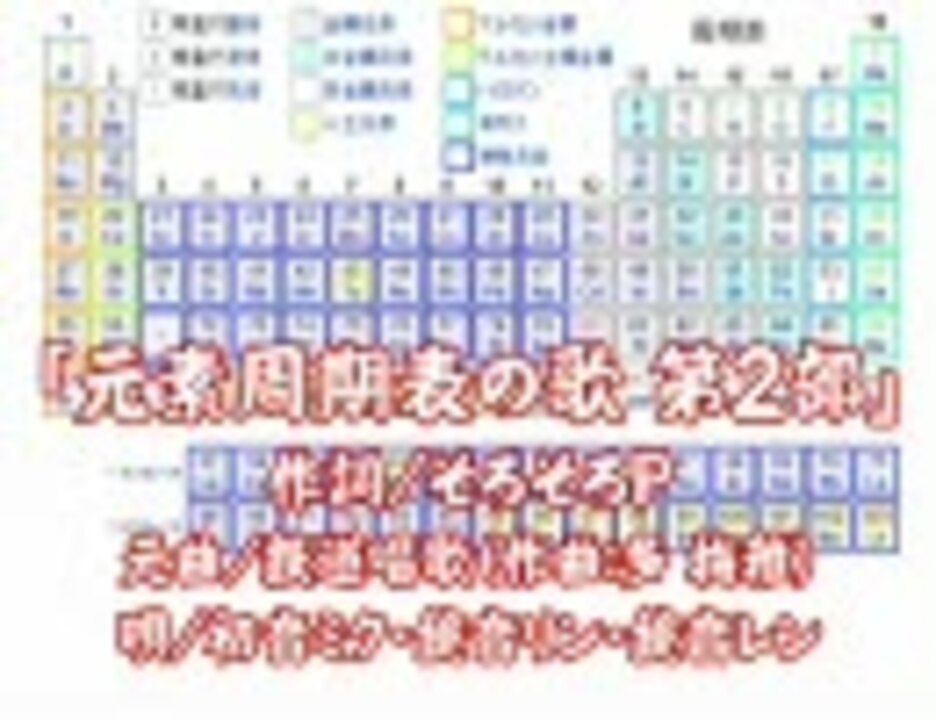 周期表の歌 第2部です。第1部→<a href="https://www.nicovideo.jp/watch/sm4907160" class="watch">sm4907160</a> 第3部→<a href="https://www.nicovideo.jp/watch/sm4922218" class="watch">sm4922218</a>円周率とか電車の駅名が歌になっているので、中学や高校の理科で出てくる「元素周期表」も歌になってもいいじゃない? と思って作ってみました。元曲は鉄道唱歌です。第2部では、37番元素から71番元素まで歌いました第2部の元素は、結構身近で使われていたりするのですが、縁の下の力持ちみたいな使われ方で、コレ!といった代表用途が浮かばないものがほとんどなので、第1部と違って動画はちょっとさみしいかも・・・?他の作品→<a href="https://www.nicovideo.jp/mylist/4653434" target="_blank" rel="noopener">mylist/4653434</a>直近20件→<a href="https://www.nicovideo.jp/mylist/6720332" target="_blank" rel="noopener">mylist/6720332</a>動画には口パク用ソフトとしてLipsync(<a href="http://www32.atwiki.jp/lipsync/)&さなり氏のキャラ素材を利用しております" target="_blank" rel="noopener nofollow">http://www32.atwiki.jp/lipsync/)&さなり氏のキャラ素材を利用しております</a>