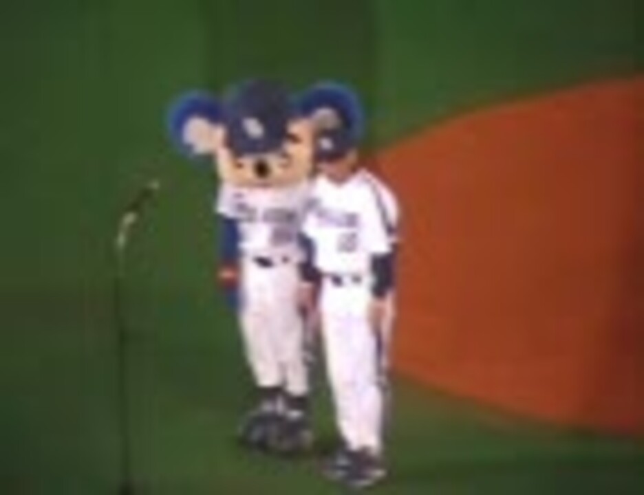 落合監督挨拶の場面より。監督とドアラ仲が良いですなぁ。
