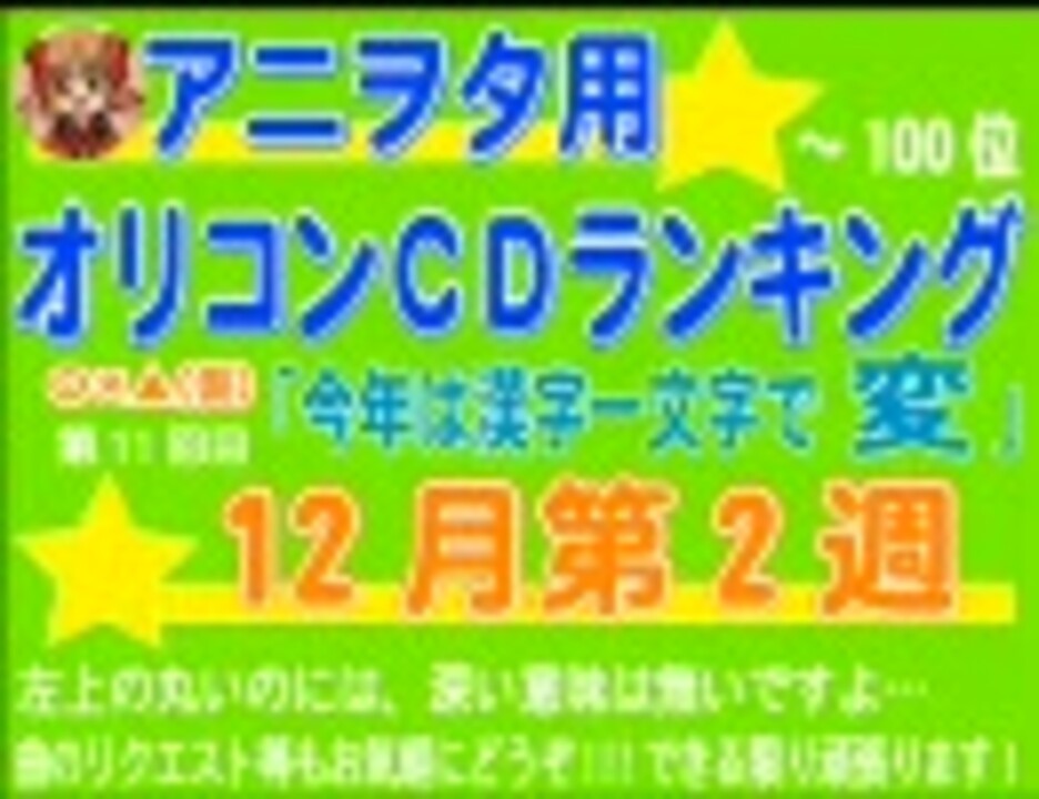 高画質版を作成しました:<a href="https://www.nicovideo.jp/watch/sm5590477" class="watch">sm5590477</a> ご意見お願いいたします!<br />うp主は、ランキングという名の、曲紹介動画のつもりで作ってます!<br />アニソンとそうでないもの(アニタイ曲)の区別は付きません…<br />今週の補足とおまけ:<a href="https://www.nicovideo.jp/watch/sm5581975" class="watch">sm5581975</a> インストについて&冒険彗星のC/W &ED曲のフルです!<br />ロリコンホイホイ:<a href="https://www.nicovideo.jp/watch/sm5591645" class="watch">sm5591645</a> 可憐ガールズです!<br />オリコン年間トップ100から、いつものとおり抽出を行ったもの:<a href="https://www.nicovideo.jp/watch/sm5560675" class="watch">sm5560675</a> 気が向いたらご覧下さいませ。<br /><br />次週:<a href="https://www.nicovideo.jp/watch/sm5644762" class="watch">sm5644762</a> 過去分のマイリスト:<a href="https://www.nicovideo.jp/mylist/9146651" target="_blank" rel="noopener">mylist/9146651</a><br />ブログ:<a href="http://5016190.cocolog-nifty.com/blog/" target="_blank" rel="noopener nofollow">http://5016190.cocolog-nifty.com/blog/</a> ☆101~:<a href="https://www.nicovideo.jp/watch/sm5587319" class="watch">sm5587319</a> コミック(先週分):<a href="https://www.nicovideo.jp/watch/nm5586143" class="watch">nm5586143</a>( <a href="https://www.nicovideo.jp/watch/nm5543689" class="watch">nm5543689</a> )<br />