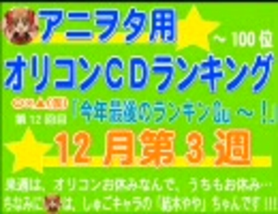 ※OP&EDで使用した曲&1部の曲の賞味期限が切れました…修正はしませんが…<br /><font color="#0000ff">当面の間は、40M以内のファイルサイズでうpしてまいります!</font><br />重くて再生でき無ければ意味ありません…今の枠でできる限り品質を高めて参りますので、ご理解下さいませ。<br />※今年最後になります!次週はオリコンがお休みの為、更新いたしません!<br /><br />あんまり趣味と言われたので、こんなの作ってみました:<a href="https://www.nicovideo.jp/watch/sm5661516" class="watch">sm5661516</a> &<a href="https://www.nicovideo.jp/watch/sm5616703" class="watch">sm5616703</a> さらにBuono!100%:<a href="https://www.nicovideo.jp/watch/sm5670366" class="watch">sm5670366</a><br />次週:<a href="https://www.nicovideo.jp/watch/sm5778239" class="watch">sm5778239</a> 過去分のマイリスト:<a href="https://www.nicovideo.jp/mylist/9146651" target="_blank" rel="noopener">mylist/9146651</a> 趣味のマイリスト:<a href="https://www.nicovideo.jp/mylist/10120137" target="_blank" rel="noopener">mylist/10120137</a><br />ブログ:<a href="http://5016190.cocolog-nifty.com/blog/" target="_blank" rel="noopener nofollow">http://5016190.cocolog-nifty.com/blog/</a> 101~:<a href="https://www.nicovideo.jp/watch/sm5658138" class="watch">sm5658138</a> コミック(先週分):<a href="https://www.nicovideo.jp/watch/nm5687972" class="watch">nm5687972</a>( <a href="https://www.nicovideo.jp/watch/nm5586143" class="watch">nm5586143</a> )<br /><br />年間トップ100(アニヲタ部門):<a href="https://www.nicovideo.jp/watch/sm5614933" class="watch">sm5614933</a> ※自分がうpしたものではありません!