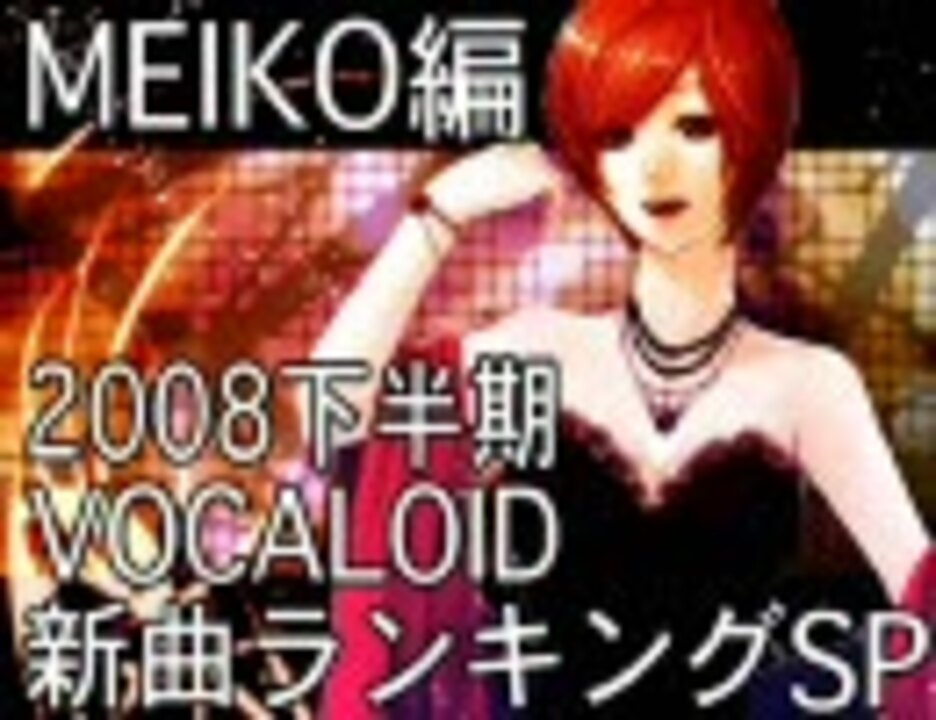 ■集計対象:2008/6/24~2008/12/24投稿のMEIKO使用動画<br />■集計方法:2008/12/26 0時のマイリスト数<br />■その他詳細は動画でご確認ください<br />■プレイリスト:<a href="https://www.nicovideo.jp/mylist/10252811" target="_blank" rel="noopener">mylist/10252811</a><br />■新曲SP KAITO編:<a href="https://www.nicovideo.jp/watch/sm5703925" class="watch">sm5703925</a><br />鏡音編:<a href="https://www.nicovideo.jp/watch/sm5703127" class="watch">sm5703127</a><br />初音編:<a href="https://www.nicovideo.jp/watch/sm5706600" class="watch">sm5706600</a>/<a href="https://www.nicovideo.jp/watch/sm5707584" class="watch">sm5707584</a><br />がくぽ編:<a href="https://www.nicovideo.jp/watch/sm5717409" class="watch">sm5717409</a><br />複数・海外編:<a href="https://www.nicovideo.jp/watch/sm5704746" class="watch">sm5704746</a><br />PV・映像編:<a href="https://www.nicovideo.jp/watch/sm5704952" class="watch">sm5704952</a><br />MMD編:<a href="https://www.nicovideo.jp/watch/sm5704118" class="watch">sm5704118</a> <br />■スクリプトで次の新曲SPに飛びます 次:初音編
