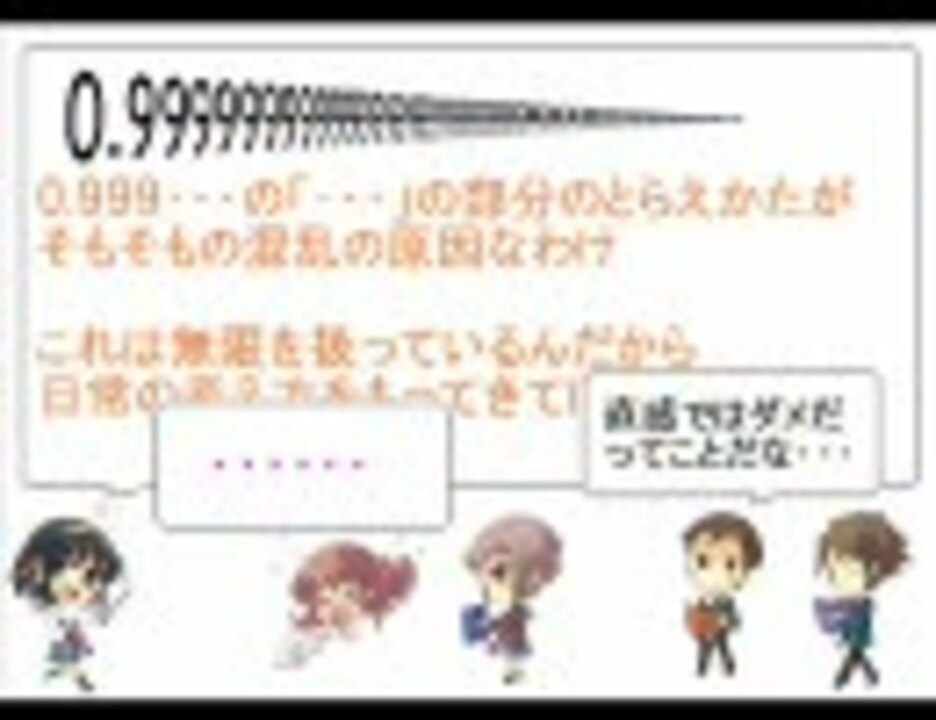 <b>0.999・・・について。</b><br />年末の楽しみを捨てて作ったが時間がなかったので突貫工事になってしまったかもしれないorz。<br />一応<font size="3" color="red">ネタ動画</font>です楽しんでください。<br />★明けましておめでとうございます。今年初をとれて感動しました。<br />★タグありがとうございます。<br /><font size="3" color="blue">★この動画は0秒ジャストを狙ったわけではなく0.999・・・秒を狙いました(`・ω・´)キリッ</font><br /><参考文献><a href="http://www4.airnet.ne.jp/tmt/index.html" target="_blank" rel="noopener nofollow">http://www4.airnet.ne.jp/tmt/index.html</a> <br />★マイリスト→<a href="https://www.nicovideo.jp/mylist/4101808" target="_blank" rel="noopener">mylist/4101808</a><br />★うp主は参考文献に忠実に動画を作っております。<br />★前回2008→<a href="https://www.nicovideo.jp/watch/sm1917326" class="watch">sm1917326</a><br />★次2010→<a href="https://www.nicovideo.jp/watch/sm9255283" class="watch">sm9255283</a><br />★センター数学対策→<a href="https://www.nicovideo.jp/watch/sm5631494" class="watch">sm5631494</a><br />
