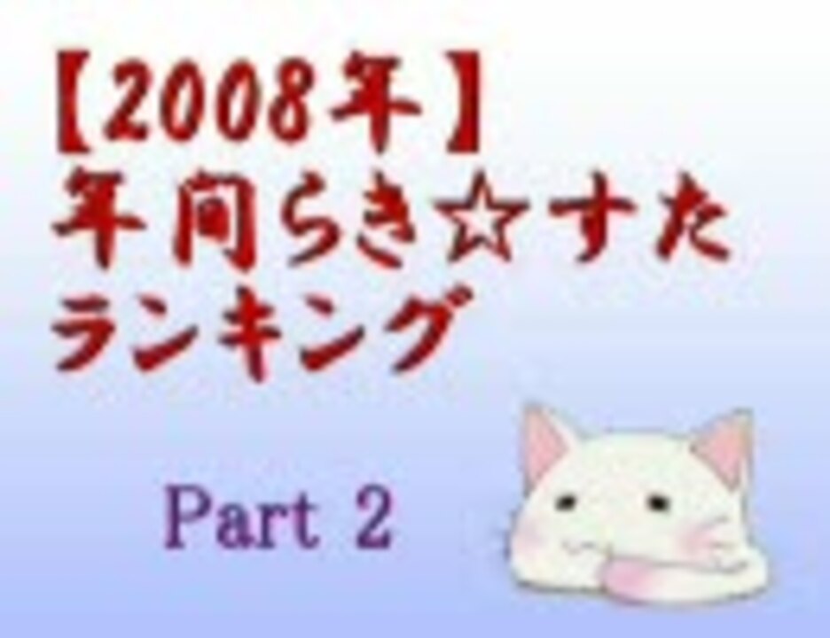 ■集計期間:2007年12月25日5時~2008年12月25日5時<br />■集計日 :2008年12月26日5時<br />■集計対象:上記の集計期間内に新規投稿されて「らき☆すた」ダグがついている関連動画<br />■集計方法:再生数+コメント(補正値)+マイリスト×20<br />────────────────────<br />■part1→<a href="https://www.nicovideo.jp/watch/sm5817283" class="watch">sm5817283</a> part3→<a href="https://www.nicovideo.jp/watch/sm5817988" class="watch">sm5817988</a><br />■1~75位+ピックアップ動画 <a href="https://www.nicovideo.jp/mylist/10338695" target="_blank" rel="noopener">mylist/10338695</a> ■らき☆すたランキング一覧 <a href="https://www.nicovideo.jp/mylist/11873156" target="_blank" rel="noopener">mylist/11873156</a><br />■お借りしたBGM→<a href="https://www.nicovideo.jp/watch/sm572998" class="watch">sm572998</a><br /><br /><br />ふんがー<br /><br /><br />