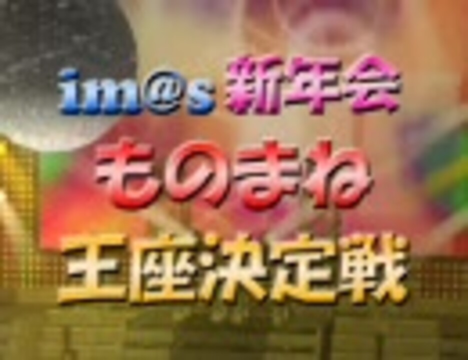 【新年会制作局より】<br /><font color="#ff0000">枠は30分ごとに公開です。中継動画から次の時間枠の動画に飛んで下さい</font><br /><br />困った時はwikiへ→<a href="http://www1.atwiki.jp/imas12hsp/" target="_blank" rel="noopener nofollow">http://www1.atwiki.jp/imas12hsp/</a><br /><br />15時中継動画:<a href="https://www.nicovideo.jp/watch/sm5873390" class="watch">sm5873390</a><br />16時中継動画:<a href="https://www.nicovideo.jp/watch/sm5873618" class="watch">sm5873618</a><br /><br /><15:00~15:30枠の他の動画><br />ゆP:<a href="https://www.nicovideo.jp/watch/sm5854208" class="watch">sm5854208</a> せりざわP:<a href="https://www.nicovideo.jp/watch/sm5854384" class="watch">sm5854384</a><br /><br /><15:30~16:00枠の他の動画><br />ニセP:<a href="https://www.nicovideo.jp/watch/sm5854553" class="watch">sm5854553</a> アルビレオP:<a href="https://www.nicovideo.jp/watch/sm5854654" class="watch">sm5854654</a><br /><br /><作者より一言><br />こんにちは、j@paPです。アイドル対決の、ものまね番組を以前から見てみたいと思っていたので、作ってしまいました。<br />いろいろヒドいことになってしまって、申し訳ありません・・・