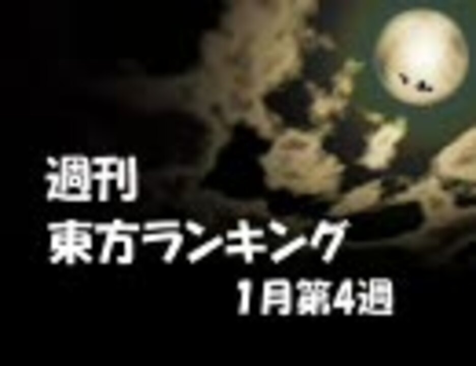 1月第4週作品リスト[<a href="https://www.nicovideo.jp/mylist/8656269" target="_blank" rel="noopener">mylist/8656269</a>] ☆週刊東方ランキング一覧[<a href="https://www.nicovideo.jp/mylist/6433069" target="_blank" rel="noopener">mylist/6433069</a>]<br />[<a href="https://www.nicovideo.jp/watch/sm5873946" class="watch">sm5873946</a>]←1月第3週 1月第5週→[<a href="https://www.nicovideo.jp/watch/sm5939707" class="watch">sm5939707</a>]<br /><br />【集計期間】 1/17(土) 0:00 - 1/24(金) 23:59<br />【集計方法】 ポイント数 = マイリスト数 + (再生数 ÷ 20)<br />【集計対象】 東方タグがついている作品、タイトルに東方が含まれる作品<br /><br />掲示板→<a href="http://www2.atchs.jp/toho/" target="_blank" rel="noopener nofollow">http://www2.atchs.jp/toho/</a> 除外議論はこちらから<br />wiki→<a href="http://www39.atwiki.jp/tohoranking" target="_blank" rel="noopener nofollow">http://www39.atwiki.jp/tohoranking</a><br />画像掲示板→<a href="http://www5.atpages.jp/tohonico/joyful/" target="_blank" rel="noopener nofollow">http://www5.atpages.jp/tohonico/joyful/</a><br /><br />
