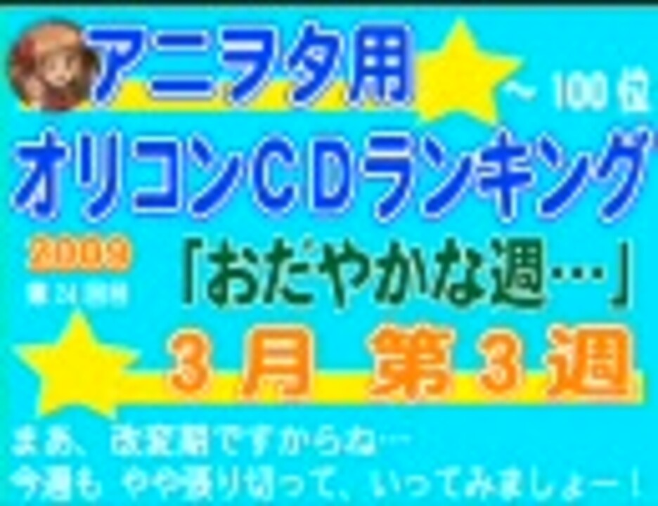 101~完成です:<a href="https://www.nicovideo.jp/watch/sm6554162" class="watch">sm6554162</a>いつもご視聴、誠にありがとうございます。今週もよろしくお願いいたします。<br />69位の曲は、あってるらしいです。※携帯では、順位増減ランクダウンになってましたが…<br /><br />■しゅごアルバム紹介:<a href="https://www.nicovideo.jp/watch/sm6490514" class="watch">sm6490514</a> ハルヒランキング:<a href="https://www.nicovideo.jp/watch/sm6510165" class="watch">sm6510165</a> プリキュア映画曲紹介:<a href="https://www.nicovideo.jp/watch/sm6497610" class="watch">sm6497610</a><br />■ランキング 次週:<a href="https://www.nicovideo.jp/watch/sm6613085" class="watch">sm6613085</a> 101~200(先週分):<a href="https://www.nicovideo.jp/watch/sm6554162" class="watch">sm6554162</a>(<a href="https://www.nicovideo.jp/watch/sm6482614" class="watch">sm6482614</a>)※A&Gダイジェスト<br />■コミックランキング(先週分):<a href="https://www.nicovideo.jp/watch/nm6583015" class="watch">nm6583015</a>(<a href="https://www.nicovideo.jp/watch/nm6511684" class="watch">nm6511684</a>)<br />■マイリスト ランキング: <a href="https://www.nicovideo.jp/mylist/9146651" target="_blank" rel="noopener">mylist/9146651</a> 趣味: <a href="https://www.nicovideo.jp/mylist/10120137" target="_blank" rel="noopener">mylist/10120137</a> 懐ソン紹介: <a href="https://www.nicovideo.jp/mylist/11175659" target="_blank" rel="noopener">mylist/11175659</a><br />■やや動動画紹介ブログ:<a href="http://5016190.cocolog-nifty.com/blog/" target="_blank" rel="noopener nofollow">http://5016190.cocolog-nifty.com/blog/</a><br />アルバムでOST除外:何も記載せずに除外した事なんてありませんよ…新曲が含まれないOSTは100位内にランクインしないだけです。