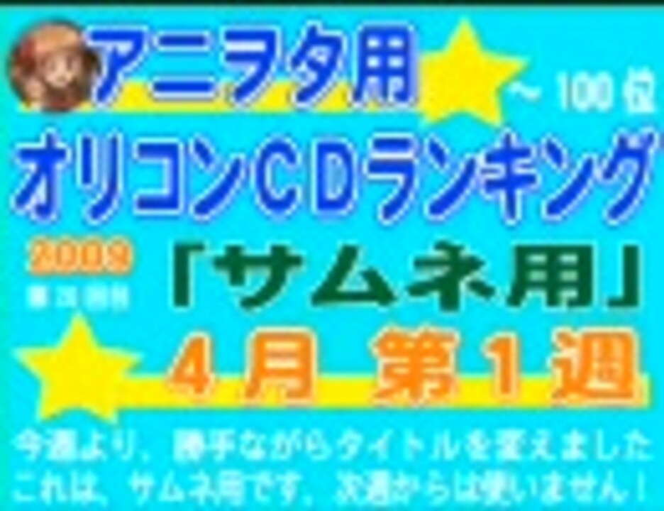 ありえない…やられました…テスト用のこの動画が残ってるのに、有料アカで上げたやつが消されたorz 仕方が無いのでコレを今週分で公開します! 来週から動画の名称が変わります。マイリスト等はそのままですので、お願いいたします。※詳しくはブログで補足します。 ■ランキング 次週:<a href="https://www.nicovideo.jp/watch/sm6753559" class="watch">sm6753559</a> 101~200(先週分):簡易版:<a href="https://www.nicovideo.jp/watch/sm6699960" class="watch">sm6699960</a>(<a href="https://www.nicovideo.jp/watch/sm6626988" class="watch">sm6626988</a>)■コミックランキング(先週分):<a href="https://www.nicovideo.jp/watch/nm6718159" class="watch">nm6718159</a>(<a href="https://www.nicovideo.jp/watch/nm6655154" class="watch">nm6655154</a>) ■マイリスト ランキング: <a href="https://www.nicovideo.jp/mylist/9146651" target="_blank" rel="noopener">mylist/9146651</a> 趣味: <a href="https://www.nicovideo.jp/mylist/10120137" target="_blank" rel="noopener">mylist/10120137</a> 懐ソン紹介: <a href="https://www.nicovideo.jp/mylist/11175659" target="_blank" rel="noopener">mylist/11175659</a> ■やや動動画紹介ブログ:<a href="http://5016190.cocolog-nifty.com/blog/" target="_blank" rel="noopener nofollow">http://5016190.cocolog-nifty.com/blog/</a> 今週も、やや長い(20分)ですが、よろしくお願いいたします!来週からは「A&Gオリコンダイジェスト」でうpいたします。 101-200位:<a href="https://www.nicovideo.jp/watch/sm6716918" class="watch">sm6716918</a>※他の方が作ってくれたもの