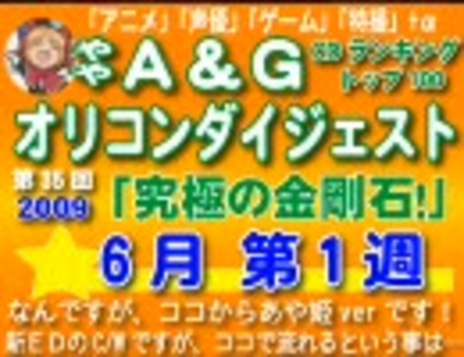 今週は、標準的な曲数ですが、若干長くなってしまいました(汗)<br />若干つなぎミスったところがありますが、時間が無いのでご勘弁を…<br /><br />■ランキング 次週:<a href="https://www.nicovideo.jp/watch/sm7368827" class="watch">sm7368827</a> ■101-200簡易版(先週分):<a href="https://www.nicovideo.jp/watch/sm7314032" class="watch">sm7314032</a>(<a href="https://www.nicovideo.jp/watch/sm7246421" class="watch">sm7246421</a>) ■コミックランキング(先週分):<a href="https://www.nicovideo.jp/watch/nm7268462" class="watch">nm7268462</a>(<a href="https://www.nicovideo.jp/watch/nm7268462" class="watch">nm7268462</a>)<br />■マイリスト ランキング: <a href="https://www.nicovideo.jp/mylist/9146651" target="_blank" rel="noopener">mylist/9146651</a> 趣味: <a href="https://www.nicovideo.jp/mylist/10120137" target="_blank" rel="noopener">mylist/10120137</a> 懐ソン紹介:<a href="https://www.nicovideo.jp/mylist/11175659" target="_blank" rel="noopener">mylist/11175659</a><br />■やや動動画紹介ブログ:<a href="http://5016190.cocolog-nifty.com/blog/" target="_blank" rel="noopener nofollow">http://5016190.cocolog-nifty.com/blog/</a><br /><br />独り言…100%ランキング用に買ったCDがランクインしなかったorz<br />恥ずかしかったのに…101位~で紹介しますので、お楽しみに…早口言葉の練習でもしよう(泣)<br />訂正<br />今井麻美=ミンゴス 下田麻美=あさぽん 2箇所間違いましたorz 何でミスったのか記憶が無いです…<br />101-200完成!:<a href="https://www.nicovideo.jp/watch/sm7314032" class="watch">sm7314032</a>