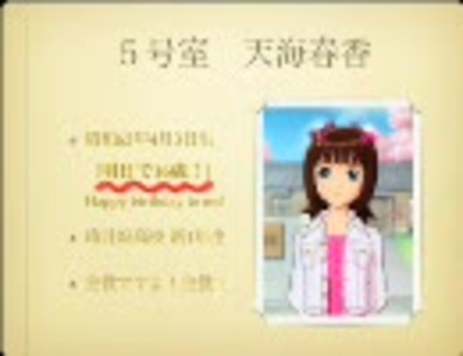 ●キャラクター紹介と、おまけミニドラマです。<br /> 連載を持ったからには一度やってみたかったのです。<br />●今回は試しにプレゼンテーションソフトで動画を制作してみました。<br /> いやはや紙芝居クリエーターの偉大さが身に染みました。<br /> これからは神芝居クリエーターと呼ぶことにします。<br />●寄せ書きの「正解」画像をブログに載せておきます。<br /> <a href="http://sukkiripon.blog91.fc2.com/blog-entry-28.html" target="_blank" rel="noopener nofollow">http://sukkiripon.blog91.fc2.com/blog-entry-28.html</a><br /><font color="red">※あ、伊織と響の部屋番号、逆だった!まあ、どっちでもいいか!</font><br /><br />●ブログ(制作話等):<a href="http://sukkiripon.blog91.fc2.com/" target="_blank" rel="noopener nofollow">http://sukkiripon.blog91.fc2.com/</a><br />●アイドル寮空室あり!:<a href="https://www.nicovideo.jp/mylist/12438435" target="_blank" rel="noopener">mylist/12438435</a> 制作物まとめ:<a href="https://www.nicovideo.jp/mylist/13242803" target="_blank" rel="noopener">mylist/13242803</a>
