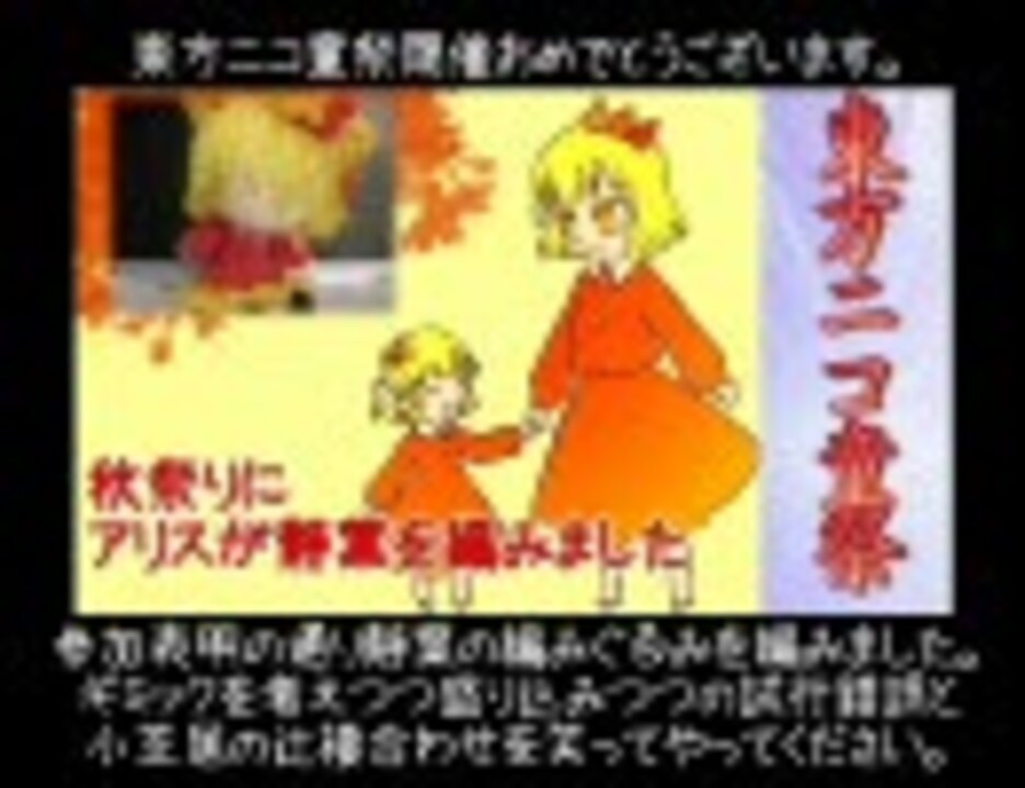 ニコ童祭の開催日が秋なので静葉の編みぐるみを解説してみました。■動画編集を13氏に担当して頂きました。御自身の祭り用動画もあるのに作って頂き有り難う御座いました。m(_ _)m■編み動画まとめ→<a href="https://www.nicovideo.jp/mylist/8550262" target="_blank" rel="noopener">mylist/8550262</a>■使用曲(参照可能な限りで):序章<a href="https://www.nicovideo.jp/watch/sm7265591" class="watch">sm7265591</a>、本編<a href="https://www.nicovideo.jp/watch/sm7809947" class="watch">sm7809947</a>、終章<a href="https://www.nicovideo.jp/watch/sm6481212" class="watch">sm6481212</a>■背景素材借りました:<a href="http://tomasan.hp.infoseek.co.jp/index.html■補足■今まで作った人形達は編集担当の元へ嫁いで行きました" target="_blank" rel="noopener nofollow">http://tomasan.hp.infoseek.co.jp/index.html■補足■今まで作った人形達は編集担当の元へ嫁いで行きました</a>。