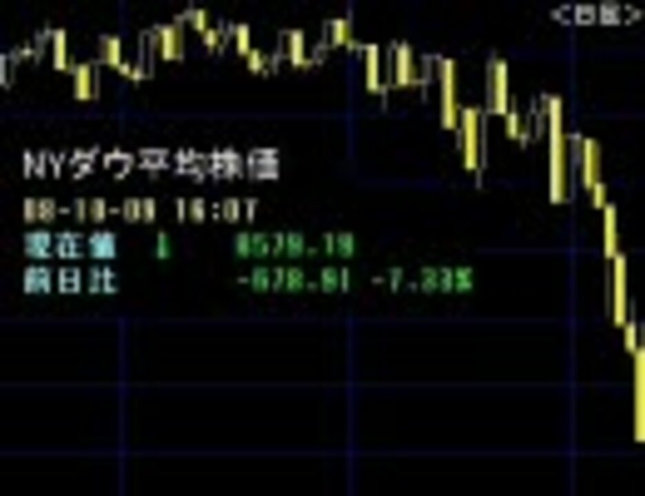 自分は相場で飯を食って3年半になりますが、2008年10月10日の日経先物サーキットブレーカー発動(15分間取引停止)は最も衝撃的な出来事でした。その1周年を記念して、動画を作ってみました。 ◆MINICQQPERさんのYoutube動画から、貴重な映像をお借りしました。MINICQQPERさん、どうもありがとうございました!<a href="http://www.youtube.com/watch?v=uYpTyfkKidQ" target="_blank" rel="noopener nofollow">http://www.youtube.com/watch?v=uYpTyfkKidQ</a> ◆BGMは、G-ダライアスの“KIMERA-Ⅱ”というゲーム音楽です。 ◆2周年を記念して、おまけをうpしました。 2008/10/14・サーキットブレーカー画像集 <a href="https://www.nicovideo.jp/watch/sm12425103" class="watch">sm12425103</a> ◆前:パニック伝説 <a href="https://www.nicovideo.jp/watch/sm4653719" class="watch">sm4653719</a> 次:曲がり道 <a href="https://www.nicovideo.jp/watch/sm9289910" class="watch">sm9289910</a> 投資・時事MADうpリスト <a href="https://www.nicovideo.jp/mylist/31024428" target="_blank" rel="noopener">mylist/31024428</a><br><br>(追記)warszawa様、広告ありがとうございます!嬉しいです!