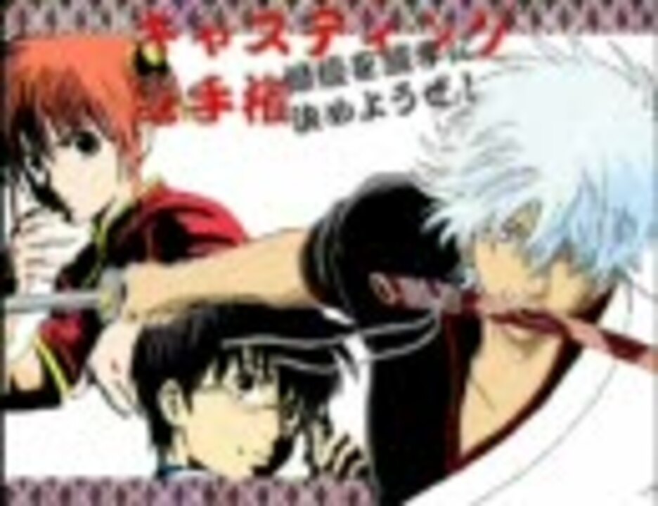 実写版キャスティングを勝手にやってしまおう!<br />少年ジャンプで連載中「銀魂」を決めたぞ!<br /><br />2009年11月3日のニコ生にて決定したキャスティングを発表!<br />リスナーが候補挙げ、投票によって役者を決定!<br /><br />その他のキャスティング⇒<a href="https://www.nicovideo.jp/mylist/15262212" target="_blank" rel="noopener">mylist/15262212</a><br /><br />動画に協力してくれた人たち<br />●銀さん=てらっち(co105171) ●新八=阪み~(co39251)●神楽=☆楓☆(co108149) ●まだお=れいにぃ(co85312)<br />●土方=DEEN(co79423) ●沖田=ジミ~(co51152)●桂=執事 大(co62728)<br /><br />GWに<font size=4><b>「銀魂-新訳紅桜編-」</b></font>のキャスティング放送を行います!!<br /><font size=4><b>日時:</b></font><font color=red size=4>放送前半の様子⇒<a href="https://live.nicovideo.jp/watch/lv15952910" target="_blank" rel="noopener">lv15952910</a></font><br /><font color=red size=4> 放送後半の様子⇒<a href="https://live.nicovideo.jp/watch/lv16537675" target="_blank" rel="noopener">lv16537675</a>⇒<a href="https://live.nicovideo.jp/watch/lv16609074" target="_blank" rel="noopener">lv16609074</a>⇒<a href="https://live.nicovideo.jp/watch/lv16610902" target="_blank" rel="noopener">lv16610902</a>⇒<a href="https://live.nicovideo.jp/watch/lv16612728" target="_blank" rel="noopener">lv16612728</a></font>
