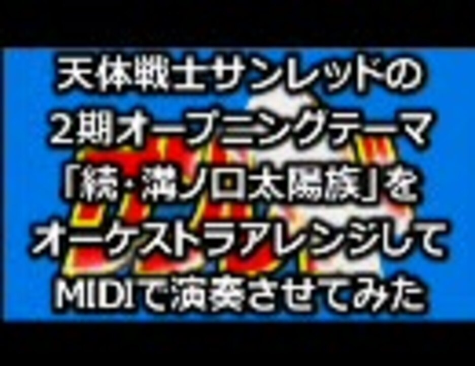 自分でオーケストラアレンジした天体戦士サンレッドの2期OP「続・溝ノ口太陽族」フルサイズです。(2009/11/27 18時 差し替え版)<br />しかも、この動画では、なんとmanzo氏ご本人にボーカルを歌ってもらいました!・・・というのは嘘で、CDから声を抽出して合成しましたw<br />ボーカルなしVer.→<a href="https://www.nicovideo.jp/watch/sm8932229" class="watch">sm8932229</a><br /><br />使用したMIDI音源は、毎度お馴染み しぶとい Roland SC-88VL と YAMAHA MU100R です。<br /><br />この動画の旧バージョン(TVサイズ版):<a href="https://www.nicovideo.jp/watch/sm8460207" class="watch">sm8460207</a><br />2期OPピアノバージョン(TV Size)ボーカル入り:<a href="https://www.nicovideo.jp/watch/sm9171727" class="watch">sm9171727</a><br />1期OPオーケストラバージョン(Full):<a href="https://www.nicovideo.jp/watch/sm5532542" class="watch">sm5532542</a><br />涼宮ハルヒの憂鬱 二期ED「止マレ!」 オーケストラバージョン:<a href="https://www.nicovideo.jp/watch/sm9094794" class="watch">sm9094794</a><br /><br />K.Mマイリスト:/<a href="https://www.nicovideo.jp/mylist/2802962" target="_blank" rel="noopener">mylist/2802962</a> コミュニティ:co102698