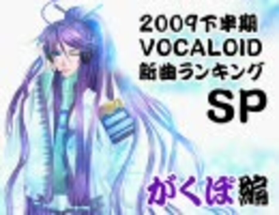 ■集計対象:2009/6/24~2009/12/14投稿のがくっぽいど歌唱動画<br />■集計方法:2009/12/22 0時のマイリスト数<br />■その他詳細は動画でご確認ください<br />■プレイリスト:<a href="https://www.nicovideo.jp/mylist/16768862" target="_blank" rel="noopener">mylist/16768862</a><br /><br />■新曲SP<br />KAITO編:<a href="https://www.nicovideo.jp/watch/sm9237329" class="watch">sm9237329</a> 鏡音編:<a href="https://www.nicovideo.jp/watch/sm9237536" class="watch">sm9237536</a> MEIKO編:<a href="https://www.nicovideo.jp/watch/sm9237602" class="watch">sm9237602</a> 初音編:<a href="https://www.nicovideo.jp/watch/sm9236061" class="watch">sm9236061</a>/<a href="https://www.nicovideo.jp/watch/sm9237665" class="watch">sm9237665</a><br />巡音編:<a href="https://www.nicovideo.jp/watch/sm9236717" class="watch">sm9236717</a> GUMI編:<a href="https://www.nicovideo.jp/watch/sm9237683" class="watch">sm9237683</a> 複数・AHS・海外編:<a href="https://www.nicovideo.jp/watch/sm9237603" class="watch">sm9237603</a> PV・映像編:<a href="https://www.nicovideo.jp/watch/sm9236318" class="watch">sm9236318</a> MMDランキングSP:<a href="https://www.nicovideo.jp/watch/sm9236927" class="watch">sm9236927</a><br /><br />■スクリプトで次の新曲SPに飛びます 次:巡音編<br /><br />■2009下半期新曲ランキングSPのマイリスト:<a href="https://www.nicovideo.jp/mylist/16757919" target="_blank" rel="noopener">mylist/16757919</a><br />