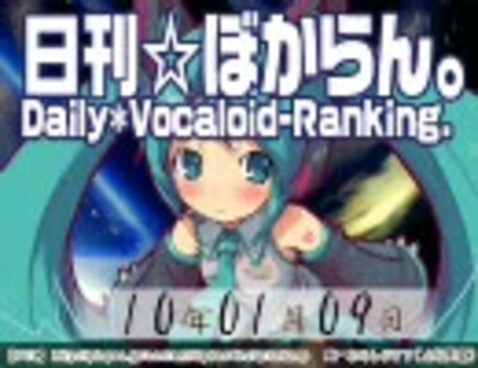 ・集計期間:~1月9日20時<br />・集計方法:再生数+コメント数×3+マイリスト数×15<br />(「コメント数×3」が再生数を超える場合、その分はカウントしません)<br />・集計対象:投稿日が1週間以内。<b>特定ワードがタイトルに含まれるか、タグロックされた動画</b><br />過去にランクインした動画は1位を除き対象外(1位は前日2~8位も対象)<br />詳しくは <a href="http://www.daily-vocaran.info" target="_blank" rel="noopener nofollow">http://www.daily-vocaran.info</a><br /><br />8 <a href="https://www.nicovideo.jp/watch/sm9289582" class="watch">sm9289582</a> 7 <a href="https://www.nicovideo.jp/watch/sm9296597" class="watch">sm9296597</a> 6 <a href="https://www.nicovideo.jp/watch/sm9285123" class="watch">sm9285123</a> 5 <a href="https://www.nicovideo.jp/watch/sm9282469" class="watch">sm9282469</a> <br />4 <a href="https://www.nicovideo.jp/watch/sm9275902" class="watch">sm9275902</a> 3 <a href="https://www.nicovideo.jp/watch/sm9319118" class="watch">sm9319118</a> 2 <a href="https://www.nicovideo.jp/watch/sm9322316" class="watch">sm9322316</a> 1 <a href="https://www.nicovideo.jp/watch/sm9311730" class="watch">sm9311730</a> <br />a <a href="https://www.nicovideo.jp/watch/sm5795755" class="watch">sm5795755</a> b <a href="https://www.nicovideo.jp/watch/sm9327411" class="watch">sm9327411</a> c <a href="https://www.nicovideo.jp/watch/sm9327877" class="watch">sm9327877</a> d <a href="https://www.nicovideo.jp/watch/sm9327417" class="watch">sm9327417</a> e <a href="https://www.nicovideo.jp/watch/nm9325841" class="watch">nm9325841</a> f <a href="https://www.nicovideo.jp/watch/sm9329568" class="watch">sm9329568</a> <br />g <a href="https://www.nicovideo.jp/watch/sm9308197" class="watch">sm9308197</a> h <a href="https://www.nicovideo.jp/watch/nm9316047" class="watch">nm9316047</a> i <a href="https://www.nicovideo.jp/watch/sm9312162" class="watch">sm9312162</a> j <a href="https://www.nicovideo.jp/watch/sm9317540" class="watch">sm9317540</a> k <a href="https://www.nicovideo.jp/watch/nm9290308" class="watch">nm9290308</a> <br /><br />日刊最新<a href="https://www.nicovideo.jp/mylist/5024496" target="_blank" rel="noopener">mylist/5024496</a> 全部<a href="https://www.nicovideo.jp/mylist/14684490" target="_blank" rel="noopener">mylist/14684490</a><br />1/8 <a href="https://www.nicovideo.jp/watch/sm9328241" class="watch">sm9328241</a> 1/10 <a href="https://www.nicovideo.jp/watch/sm9348650" class="watch">sm9348650</a><br />