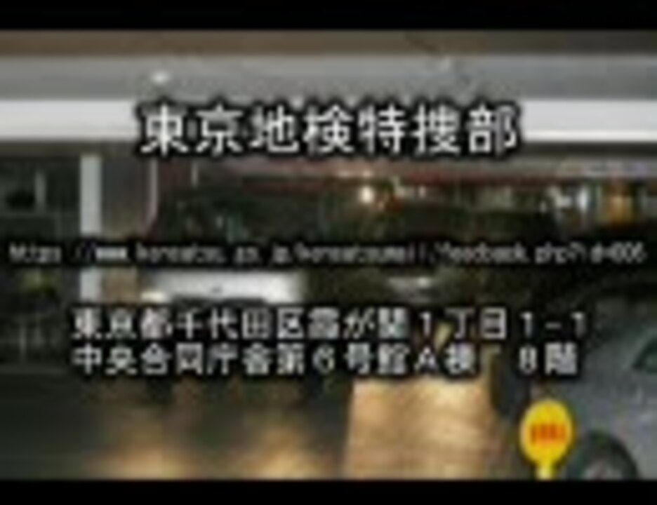 まだ「始まった」ばかりです。みなさんから東京地検に応援をお願いします。手紙は「応援文在中」と書いた方がいいかもしれません。 東京地方検察庁特別捜査部⇒<a href="https://www.kensatsu.go.jp/kensatsumail/feedback.php?id=006" target="_blank" rel="noopener nofollow">https://www.kensatsu.go.jp/kensatsumail/feedback.php?id=006</a> 東京都千代田区霞が関1丁目1-1 中央合同庁舎第6号館A棟 8階 念のため法務省にもメッセージを送りましょう。 法務省⇒<a href="http://www.moj.go.jp/houmugyousei.html" target="_blank" rel="noopener nofollow">http://www.moj.go.jp/houmugyousei.html</a> ※指摘あったので東京地検URL修正済。 まさかのイメージ化⇒<a href="https://www.nicovideo.jp/watch/sm9425061" class="watch">sm9425061</a> 外国人参政権阻止も支援お願いします⇒<a href="https://www.nicovideo.jp/watch/sm9459243" class="watch">sm9459243</a>