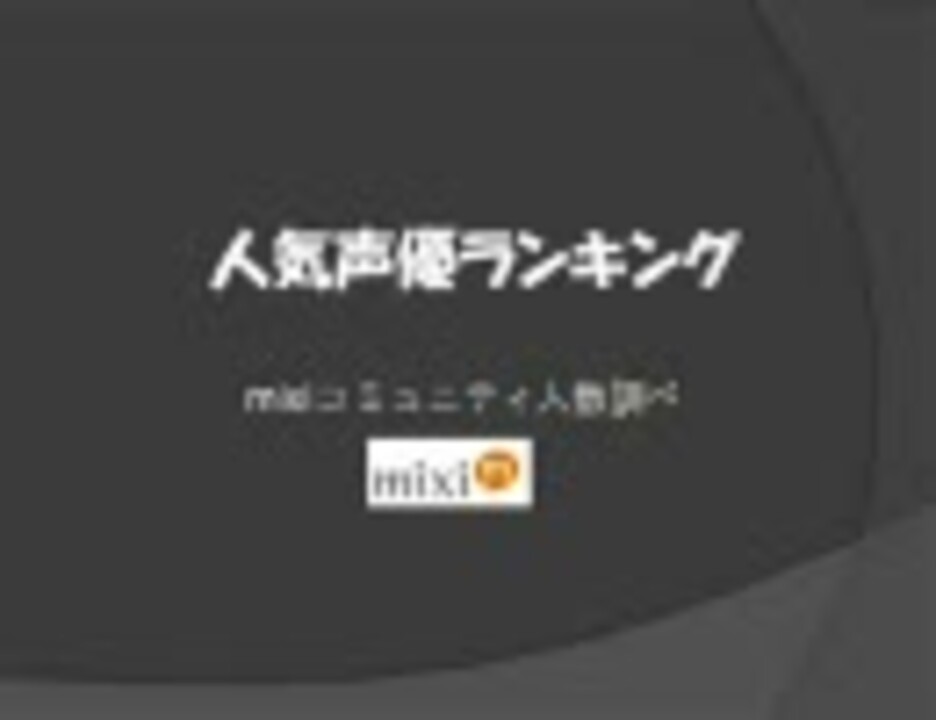 かなりの時間かけてmixiの声優コミュニティの人数を調べました。それをランキングにしてます。さて、誰が1位でしょう? ※予め謝っておくこと ①アニメのタイトルもつけるべきでした。②集計に力入れすぎて動画に力入りませんでした。③エロゲ声優さんの画像がなかなかありませんでした。④ちゃっかり芸能人っぽい人もまじってます。⑤色コメの件は忘れてください⑥画像が間違っているところがいくつかあります(エロゲ関係、鎮目)⑦風音(本当は100位以内)さん、遊佐浩二(本当は20位以内)さんを入れ忘れました。 うp主の他動画→<a href="https://www.nicovideo.jp/mylist/13508776" target="_blank" rel="noopener">mylist/13508776</a>、<a href="https://www.nicovideo.jp/mylist/12332185" target="_blank" rel="noopener">mylist/12332185</a> 完全版(集計は2011年)を作りました。気になった人はこのブログに→<a href="http://blogs.yahoo.co.jp/toukyouto_niconico/archive/2011/02/07" target="_blank" rel="noopener nofollow">http://blogs.yahoo.co.jp/toukyouto_niconico/archive/2011/02/07</a> <br />2013年版→<a href="https://www.nicovideo.jp/watch/sm19761541" class="watch">sm19761541</a>