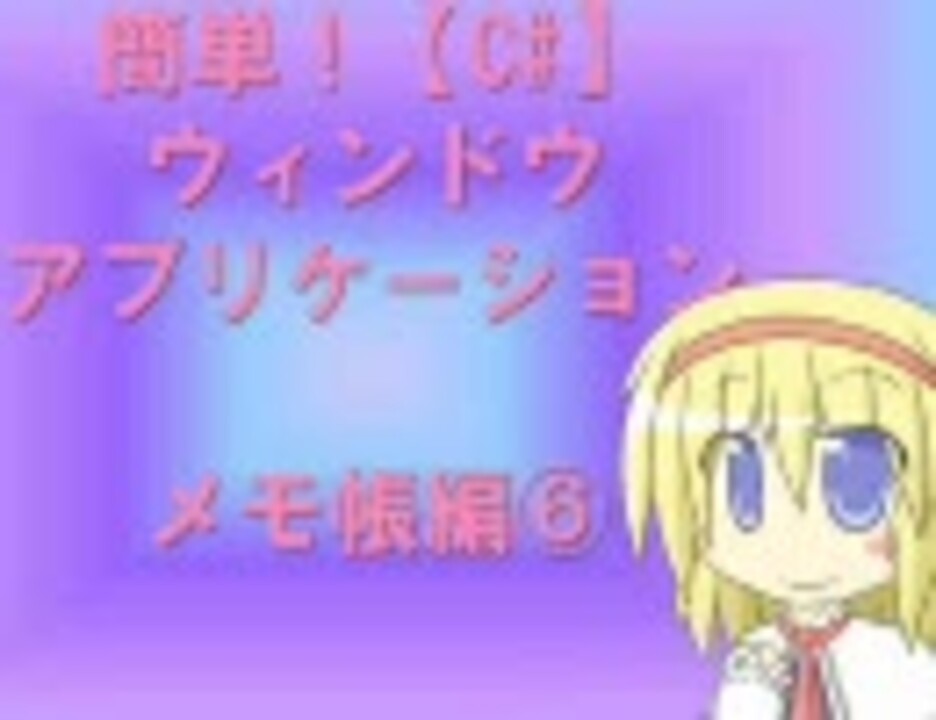 Visual C#でウィンドウアプリケーションを作ろう! 毎度どうもです。今回は、前回ハードだった分まったり進めるかと思います。でも侮っちゃだめよ! 今回から始める人は下記URLからTBmemo5.zipをダウンロードして進めてください。 立ち絵:千羽チドリ さん <a href="https://www.nicovideo.jp/mylist/8533516" target="_blank" rel="noopener">mylist/8533516</a> 音楽:こうちゃん さん <a href="https://www.nicovideo.jp/mylist/16910287" target="_blank" rel="noopener">mylist/16910287</a> ソースファイル置場: <a href="http://home.a00.itscom.net/csbdn/source_file.html" target="_blank" rel="noopener nofollow">http://home.a00.itscom.net/csbdn/source_file.html</a> メモ帳編⑤ <a href="https://www.nicovideo.jp/watch/sm9395711" class="watch">sm9395711</a> → メモ帳編⑥ (この動画) → メモ帳編⑦ <a href="https://www.nicovideo.jp/watch/sm9526060" class="watch">sm9526060</a> <a href="https://www.nicovideo.jp/mylist/15044649" target="_blank" rel="noopener">mylist/15044649</a>