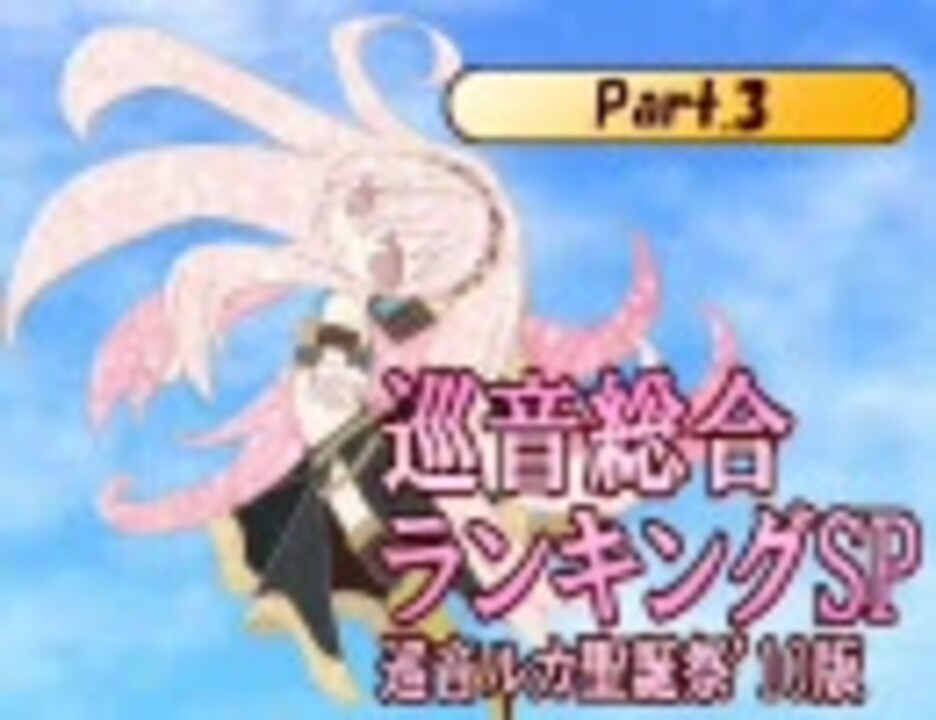 1/30は巡音ルカ聖誕祭'10!<br /><br /><b>【集計対象】</b><br />09/01/01~10/01/22投稿の「巡音ルカ」「たこルカ」関連動画<br />関連タグ必須(基準は「巡音新曲ランキング」準拠)<br />・巡音ルカがメインと判定できる楽曲・映像作品<br />・上記以外でもルカ楽曲がメインで使用されている作品(歌唱や映像にルカがいるかは問わない)<br /><br /><b>【集計方式】</b><br />10/01/23 00:00ころ集計<br />再生+コメント×3+マイリスト×15(コメントのポイントは再生数を上限とする)<br />※日刊VOCALOIDランキングと同じ方式<br /><br /><a href="https://www.nicovideo.jp/watch/sm9526529" class="watch">sm9526529</a>←Part1 <a href="https://www.nicovideo.jp/watch/sm9536349" class="watch">sm9536349</a>←Part2 プレイリスト→<a href="https://www.nicovideo.jp/mylist/17373033" target="_blank" rel="noopener">mylist/17373033</a><br />Part4(当日編+番外編)→<a href="https://www.nicovideo.jp/watch/sm9562301" class="watch">sm9562301</a><br /><br />巡音新曲ランキング(るからん)今週号→<a href="https://www.nicovideo.jp/watch/sm9528968" class="watch">sm9528968</a> バックナンバー→<a href="https://www.nicovideo.jp/mylist/11736333" target="_blank" rel="noopener">mylist/11736333</a><br /><a href="https://commons.nicovideo.jp/works/nc1803" target="_blank" rel="noopener">nc1803</a> <a href="https://commons.nicovideo.jp/works/nc13881" target="_blank" rel="noopener">nc13881</a>を使用しました。<br />