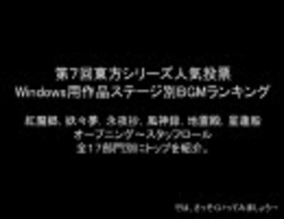 紅,妖,永,風,地,星のBGMをステージ別にランキングし、トップを紹介してます。宜しければ御覧下さいませo┐ペコリ<br />一曲が長くなって尺余りになっているものがあり、そういった曲には「少女視聴中タイム」を設けました。<br />該当曲、または他曲へのコメントなどにお使いください。<br /><br />不人気ランキングも作ってしまいました<a href="https://www.nicovideo.jp/watch/sm9813296" class="watch">sm9813296</a><br /><br />※2~3日中に第8回分を公開。<br />・・・の予定だったのですが、動画作成中に多少の紆余曲折があり、最終的に内容もやや問題有りと私個人が判断致しまして、残念ながら公開は無期延期とする事と致しました。もし楽しみにしてくださった方が居ましたら、申し訳ございません。恐らく、来年度以降も作成は無いと思います。