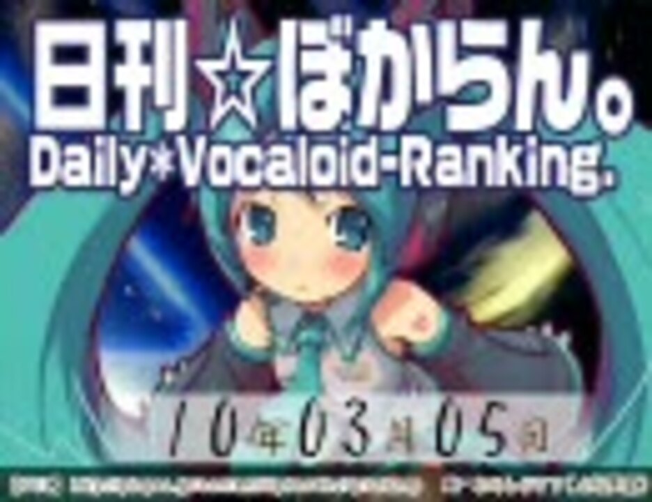 ・集計期間:~3月5日20時<br />・集計方法:再生数+コメント数×3+マイリスト数×15<br />(「コメント数×3」が再生数を超える場合、その分はカウントしません)<br />・集計対象:投稿日が1週間以内。<b>特定ワードがタイトルに含まれるか、タグロックされた動画</b><br />過去にランクインした動画は1位を除き対象外(1位は前日2~8位も対象)<br />詳しくは <a href="http://www.daily-vocaran.info" target="_blank" rel="noopener nofollow">http://www.daily-vocaran.info</a><br /><br />8 <a href="https://www.nicovideo.jp/watch/sm9872078" class="watch">sm9872078</a> 7 <a href="https://www.nicovideo.jp/watch/sm9890667" class="watch">sm9890667</a> 6 <a href="https://www.nicovideo.jp/watch/sm9892873" class="watch">sm9892873</a> 5 <a href="https://www.nicovideo.jp/watch/nm9909720" class="watch">nm9909720</a> <br />4 <a href="https://www.nicovideo.jp/watch/sm9893982" class="watch">sm9893982</a> 3 <a href="https://www.nicovideo.jp/watch/sm9908765" class="watch">sm9908765</a> 2 <a href="https://www.nicovideo.jp/watch/nm9911470" class="watch">nm9911470</a> 1 <a href="https://www.nicovideo.jp/watch/sm9905163" class="watch">sm9905163</a> <br />a <a href="https://www.nicovideo.jp/watch/sm6338750" class="watch">sm6338750</a> b <a href="https://www.nicovideo.jp/watch/sm9916643" class="watch">sm9916643</a> c <a href="https://www.nicovideo.jp/watch/nm9868747" class="watch">nm9868747</a> d <a href="https://www.nicovideo.jp/watch/nm9886954" class="watch">nm9886954</a> e <a href="https://www.nicovideo.jp/watch/sm9890847" class="watch">sm9890847</a> f <a href="https://www.nicovideo.jp/watch/sm9895573" class="watch">sm9895573</a> <br />g <a href="https://www.nicovideo.jp/watch/sm9870369" class="watch">sm9870369</a> h <a href="https://www.nicovideo.jp/watch/sm9893696" class="watch">sm9893696</a> i <a href="https://www.nicovideo.jp/watch/sm9879557" class="watch">sm9879557</a> j <a href="https://www.nicovideo.jp/watch/sm9852803" class="watch">sm9852803</a> k <a href="https://www.nicovideo.jp/watch/sm9857618" class="watch">sm9857618</a> <br /><br />日刊最新<a href="https://www.nicovideo.jp/mylist/5024496" target="_blank" rel="noopener">mylist/5024496</a> 全部<a href="https://www.nicovideo.jp/mylist/14684490" target="_blank" rel="noopener">mylist/14684490</a><br />3/4 <a href="https://www.nicovideo.jp/watch/sm9911278" class="watch">sm9911278</a> 3/6 <a href="https://www.nicovideo.jp/watch/sm9933828" class="watch">sm9933828</a><br />