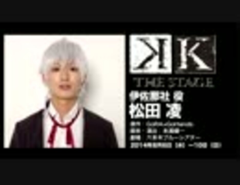 2012年に放映されるや大ヒットし、7月に劇場版も公開の大人気TVアニメ『K』の<br>舞台化作品が上演決定!!<br>原作者集団GoRAと、劇場アニメ『マルドゥック・スクランブル』でおなじみの<br>GoHandsがアニメーション制作を担当したオリジナルアニメーション。<br>現実とは微妙に異なった歴史を歩んだ現代日本を舞台に、《王》それぞれの確執と、<br>そこに巻き込まれる少年の運命が異能者バトルと共に描かれていく群像劇となっております。<br><br>いよいよ8月6日(水)から六本木ブルーシアターにて公演がスタート!<br>上演に先駆けて、キャストの皆様から熱いコメントを頂きました!<br><br><コメント収録キャスト><br>伊佐那社役/松田凌<br>夜刀神狗朗役/荒牧慶彦<br>ネコ役/亜里沙<br>草薙出雲役/寿里<br>櫛名アンナ/荻野可鈴<br>八田美咲役/植田圭輔<br>鎌本力夫役/松崎裕<br>淡島世理役/茉莉邑薫<br>伏見猿比古役/鈴木拡樹<br><br>宗像礼司役/南圭介<br>周防尊役/中村誠治郎<br><br>公式HP:<a href="http://www.marv.jp/special/stage-k/">http://www.marv.jp/special/stage-k/</a> <br><br>【作品情報】舞台『K』<br>原作:GoRA×GoHands <br>劇場:六本木ブルーシアター(東京都港区六本木5-11-12)<br>脚本・演出:末満健一<br><br>公演日程:2014年8月6日(水)~10日(日)全9公演<br>チケット【Lコード:36777】<br>指定席/7,560円(税込)<br> ※未就学児童の入場はご遠慮ください。<br>