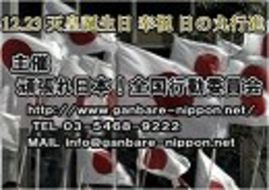 ・期日:平成27年12月23日(水・祝)<br><br>・日程:<br> 13時30分 常盤橋公園 集合 (地下鉄半蔵門線 三越前駅の西、徒歩2分)<br> ※ 一般参賀に参加された方 … 12時30分 皇居外苑和田倉噴水公園 集合<br> 14時00分 奉祝「日の丸行進」 常盤橋公園 出発<br> 15時30分 日比谷公園 到着<br> 17時00分 大忘年会(16時00分 開場)<br><br>・大忘年会:<br> 場所:サンライズビル東京 2階 「ザ・グリーンホール」<br> <a href="http://www.sunrise-bldg.jp/access/" target="_blank" rel="noopener nofollow">http://www.sunrise-bldg.jp/access/</a><br> 東京都中央区日本橋富沢町11-12 (都営新宿線 馬喰横山駅 A3出口 徒歩3分)<br> 参加費:3,500円 ※ ドリンク・食事付き<br> 【特別企画】 生放送特番 「夜桜亭 after スペシャル」<br> 出演:浅野久美、saya、水島総 ほか ゲスト多数<br><br>・主催:<br> 頑張れ日本!全国行動委員会<br> <a href="http://www.ganbare-nippon.net/" target="_blank" rel="noopener nofollow">http://www.ganbare-nippon.net/</a><br> TEL 03-5468-9222 MAIL info@ganbare-nippon.net<br><br>※チャンネル桜では、自由且つ独立不羈の放送を守るため、『日本文化チャンネル桜二千人委員会』の会員を募集しております。以下のページでご案内申し上げておりますので、全国草莽の皆様のご理解、ご協力を、何卒宜しくお願い申し上げます。<br><a href="http://www.ch-sakura.jp/579.html" target="_blank" rel="noopener nofollow">http://www.ch-sakura.jp/579.html</a><br><br>◆チャンネル桜公式HP<br><a href="http://www.ch-sakura.jp/" target="_blank" rel="noopener nofollow">http://www.ch-sakura.jp/</a>