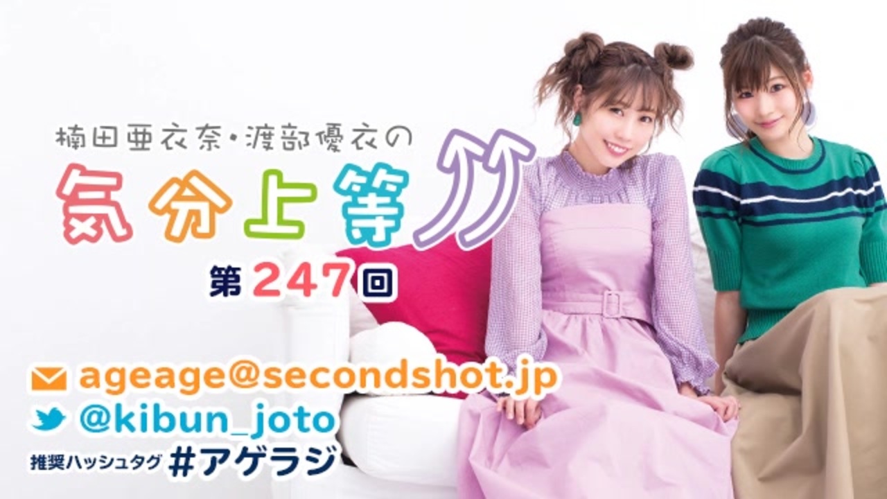 「楠田亜衣奈・渡部優衣の気分上等↑↑ 」第247回配信です。<br><br>■「楠田亜衣奈・渡部優衣の気分上等↑↑」放送情報<br>[セカンドショットちゃんねる]<br>放送時間│毎週水曜日 24:00~ 本編&アフタートーク配信<br>※本編は1週間無料(1週間後に会員限定)、アフタートークは会員限定<br>出演│楠田亜衣奈・渡部優衣<br><br>「大人のトキメキ」メールを大募集!<br>大人っぽいセリフで団員をときめかせるコーナー。<br>思わずときめくセリフを募集します!<br>ageage@secondshot.jpまで!<br><br>番組メールアドレス│ageage@secondshot.jp<br>推奨実況ハッシュタグ│#アゲラジ<br><br><br><b>アフタートークはこちら!→【<a href="http://www.nicovideo.jp/watch/1561540626" target="_blank">1561540626</a>】</b>