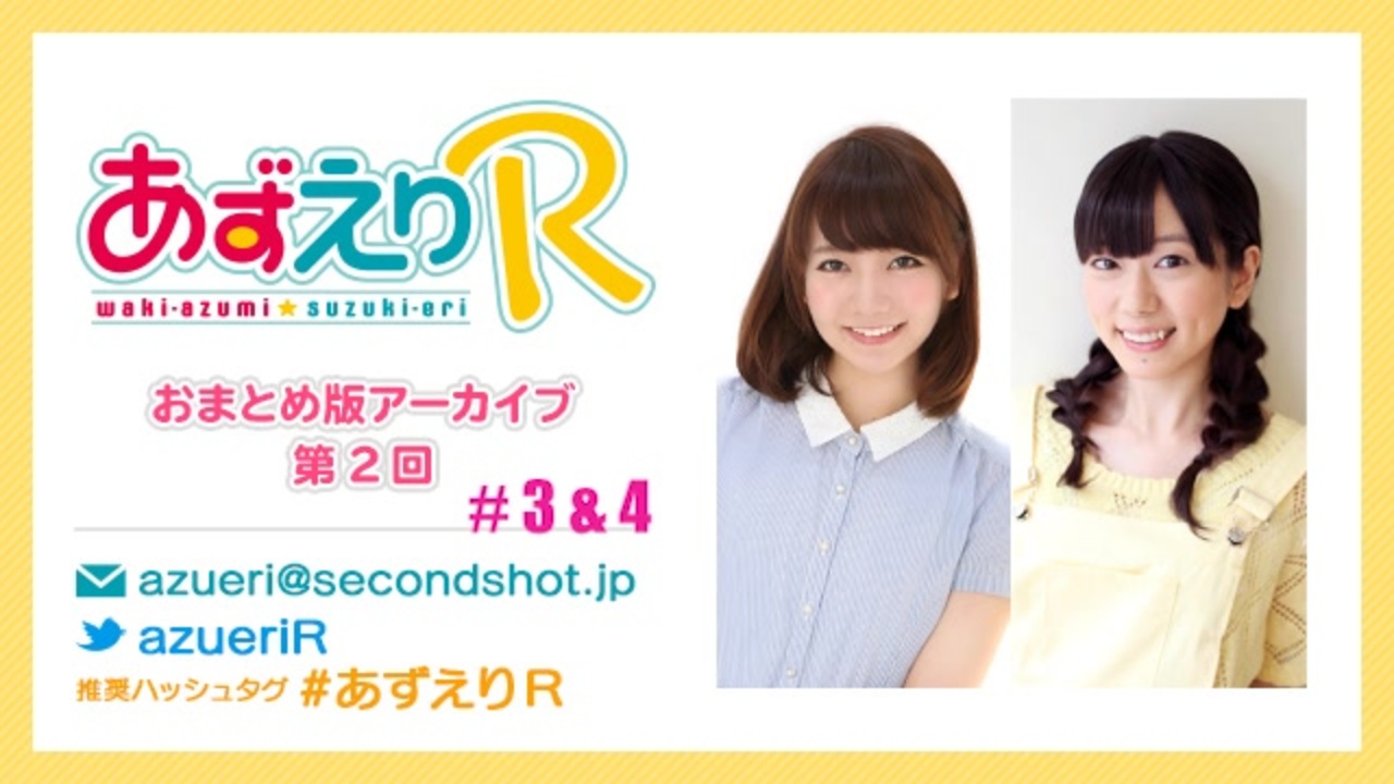 「あずえりR」第3回・第4回放送です。<br>※1週間無料公開(1週間後に会員限定)<br><br>■「あずえりR」放送情報<br>[セカンドショットちゃんねる]<br>放送│毎週火・水曜日 21:45 ごろ<br>配信|火曜日・水曜日に放送した内容が毎週水曜日24時にアーカイブとして配信※1週間無料(1週間後会員限定)<br>[出演] 和氣あず未・鈴木絵理<br>[公式ウェブサイト]<a href="http://azuerir.secondshot.jp/" target="_blank">http://azuerir.secondshot.jp/</a><br>[公式twitter]<a href="https://twitter.com/azueriR" target="_blank">@azueriR</a><br>[番組メールアドレス]<a href="mailto:azueri@secondshot.jp">azueri@secondshot.jp</a><br>推奨実況ハッシュタグ│#あずえりR<br><br><b>アフタートークはこちら!→【<a href="http://www.nicovideo.jp/watch/1563348727" target="_blank">1563348727</a>】</b>