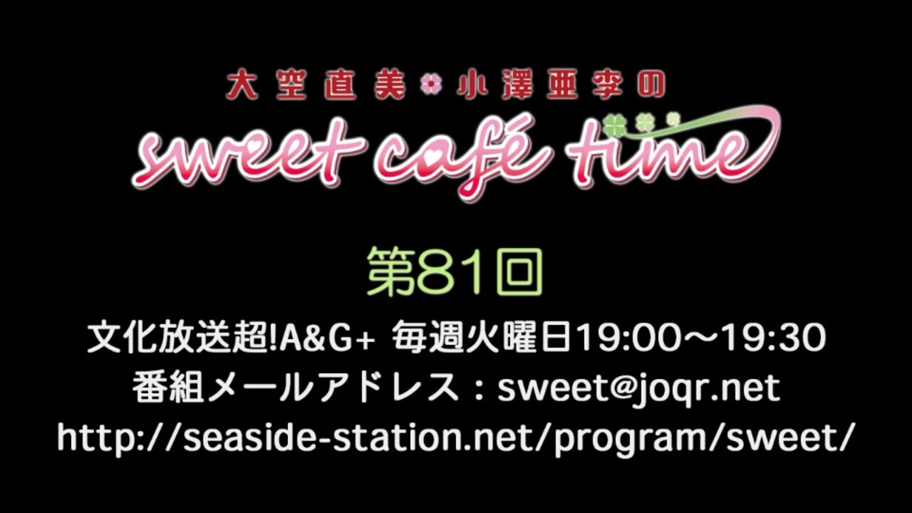 この番組はラジオの前にいるお客様の様々なニーズを叶える為に我々2人が奔走するコンセプトカフェ風ラジオバラエティです。<br><br>■番組名: 大空直美・小澤亜李のsweet café time<br>■放送局: 文化放送超!A&G+ (<a href="http://www.agqr.jp/" target="_blank">http://www.agqr.jp/</a>)<br>■放送日: 毎週火曜日 19:00~19:30<br>■アーカイブ更新: 毎週水曜日 20:00<br>■パーソナリティー: 大空直美、小澤亜李<br>■番組公式サイト: <a href="http://seaside-station.net/program/sweet/" target="_blank">http://seaside-station.net/program/sweet/</a><br>■番組ツイッター: <a href="https://twitter.com/sweet_ag5" target="_blank">@sweet_ag5</a><br>■番組メールアドレス: <a href="mailto:sweet@joqr.net">お便りはコチラ</a>