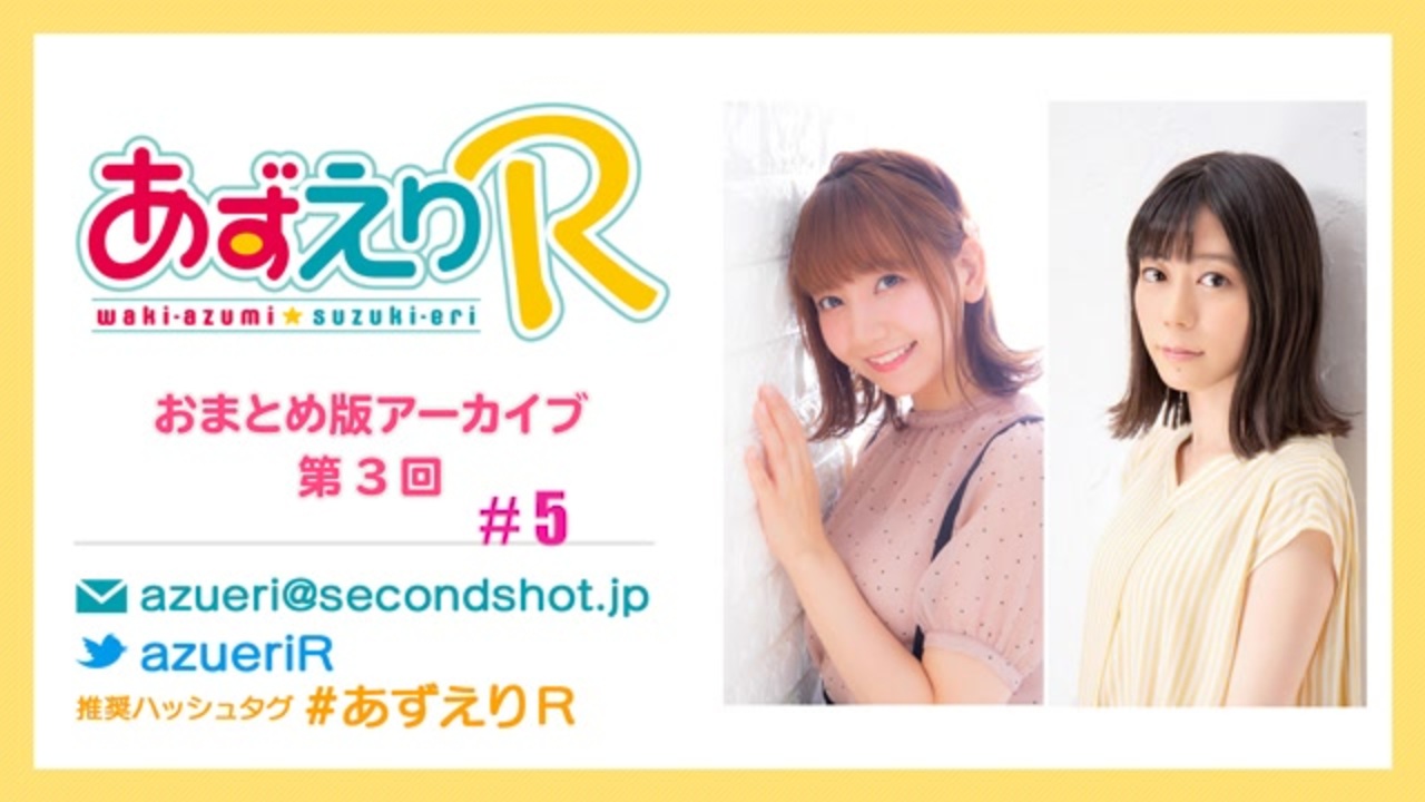 「あずえりR」第5回・第6回放送です。<br>※1週間無料公開(1週間後に会員限定)<br><br>■「あずえりR」放送情報<br>[セカンドショットちゃんねる]<br>放送│毎週火・水曜日 21:45 ごろ<br>配信|火曜日・水曜日に放送した内容が毎週水曜日24時にアーカイブとして配信※1週間無料(1週間後会員限定)<br>[出演] 和氣あず未・鈴木絵理<br>[公式ウェブサイト]<a href="http://azuerir.secondshot.jp/" target="_blank">http://azuerir.secondshot.jp/</a><br>[公式twitter]<a href="https://twitter.com/azueriR" target="_blank">@azueriR</a><br>[番組メールアドレス]<a href="mailto:azueri@secondshot.jp">azueri@secondshot.jp</a><br>推奨実況ハッシュタグ│#あずえりR<br><br><b>アフタートークはこちら!→【<a href="http://www.nicovideo.jp/watch/1563981005" target="_blank">1563981005</a>】</b>