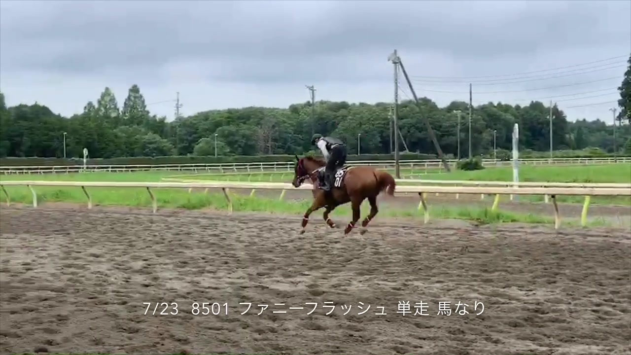 7/23と7/31のファニーフラッシュの調教の様子です。<br>今週から少しずつ負荷をかけて調教をしています。鞍上は新人の大木騎手です。<br><br><br>【7月23日の調教メニュー】<br>・800m 本馬場 単走・馬なりで追い切り<br><br> 【7月31日の調教メニュー】<br>・800m 本馬場 単走・馬なりで追い切り<br><br>【福田調教師のコメント】<br>23日の追い切りから少しずつ動かしていますが、中身がもう少し必要かなという印象です。<br>とはいえ、体幹は休み前と比べるとしっかりしてきたので、状態があがれば走りも良くなっていくと思います。<br><br>▼ファニーフラッシュの厩舎での様子を毎週火・木・土・日にお届け。<br><a href="http://live.nicovideo.jp/search?track=&sort=recent&date=&keyword=%E4%BB%8A%E6%97%A5%E3%81%AE%E3%83%95%E3%82%A1%E3%83%8B%E3%83%BC%E3%83%95%E3%83%A9%E3%83%83%E3%82%B7%E3%83%A5&filter=:reserved:&kind=">「今日のファニーフラッシュ」 次回の放送はこちらから。</a><br><br><a href="https://twitter.com/realdabista2525/">公式ツイッターもフォローよろしくお願いいたします。https://twitter.com/realdabista2525/</a><br><br>「ダービースタリオン\DERBY STALLION」は株式会社パリティビットの商標です。 ©ParityBit<br>