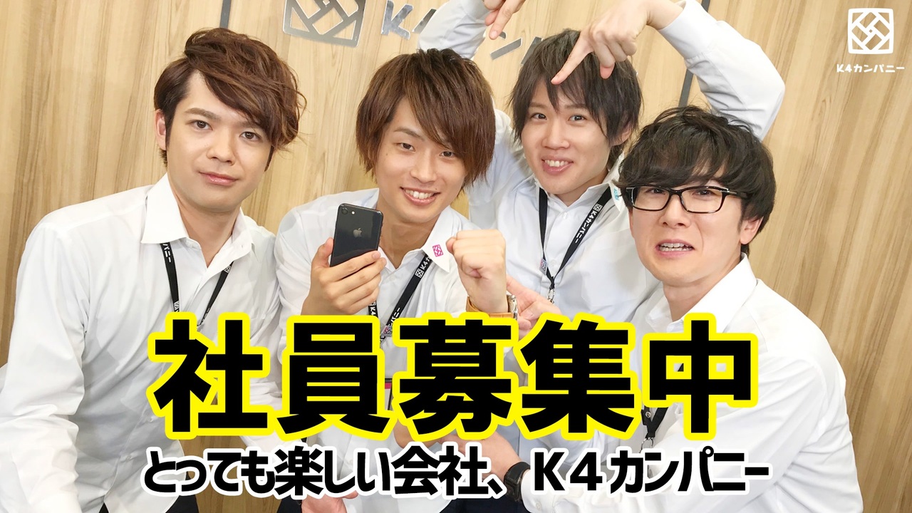 来たる慰安旅行を豪華にする為に、社員数(フォロワー数)増加に向けて施策を打ち出す!<br>1万5千人フォロワー達成で浴衣支給&宴会決定♪<br>締め切りは9月30日(月)23:59まで<br><br>☆オリジナルグッズ販売中☆<br><a href="http://shop.nizista.com/c-fpage?fp=k4company">社内販売</a><br><br>♢♦♢♦お知らせ♦♢♦♢<br><br>■K4カンパニー社員食堂<br>K4カンパニー初のコラボカフェが池袋に期間限定でOPEN!<br>4人がプロデュースしたフード&ドリンクや、オリジナルグッズの販売、展示ブースの公開など盛沢山!<br><br>◎開催期間<br>◆第2弾<br>9月6日(金)~9月23日(月)<br>プリンセスカフェ池袋館<br><br><a href="http://pripricafe.com/k4company/">K4カンパニー社員食堂特設ページ</a><br><br>■第2弾社員ミーティング「日本一接待カラオケ大会」<br>日程:2019年10月16日(土)<br>出演:濱健人、益山武明<br>場所:ベルサール六本木<br><br><a href="http://nizista.com/views/article2?id=7cd132a0bd9711e9ae33058bd9aa0aa3">特設ページ </a><br><br>■HANDEAD ANTHEM<br>K4カンパニー提供の新企画!4人の男性声優が16キャラ演じる新感覚プロジェクト<br><a href="https://handead.jp/">公式HP</a><br>公式Twitter:<a href="https://twitter.com/handead_anthem">@handead_anthem</a><br><a href="https://www.youtube.com/channel/UCsf-F8FU21Rm1wmxyfMNs7w">Youtubeチャンネル</a><br><br>【K4カンパニーとは】<br>K4カンパニーは、創立メンバー4名(小松昌平、益山武明、増元拓也、濱健人)が会社(番組)を立ち上げ、ビッグな大企業にしていく!そんなサクセスストーリー番組です!<br><br>【K4カンパニー公式Twitter】<br>@shain_boshuchu( <a href="https://twitter.com/shain_boshuchu">https://twitter.com/shain_boshuchu </a>)<br>ぜひ入社(フォロー)して社員となり、応援をよろしくお願いします!<br><br>【オリジナルグッズ】<br><a href="http://shop.nizista.com/c-fpage?fp=k4company">社内販売</a><br><br>【関連リンク】<br>ニジ★スタ:<a href="https://nizista.com/">https://nizista.com/</a><br>ニジ★スタ編集部 公式Twitter:<a href="https://twitter.com/Nizista_jp">https://twitter.com/Nizista_jp</a><br>