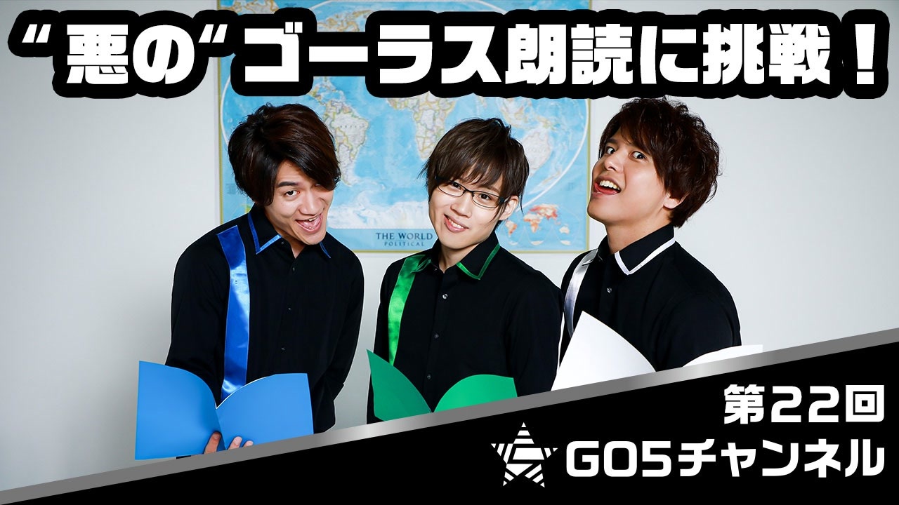 【GOALOUS5 ニコニコ動画支部】<br>GO5チャンネル 第22回<br><br>★GOALOUS5テーマソングCD「GO5!GOALOUS5!」<br>2019年11月5日発売<br><br>①販売店情報<br>GCRESTORE(ジークレストア):<a href="https://gcrest.store/products/gcp20190001g5" target="_blank" rel="noopener nofollow">https://gcrest.store/products/gcp20190001g5</a><br>アニメイトオンライン:<a href="https://www.animate-onlineshop.jp/pn/pd/1709419/" target="_blank" rel="noopener nofollow">https://www.animate-onlineshop.jp/pn/pd/1709419/</a><br>アニメイト店舗:池袋本店、梅田店、名古屋店<br><br>②特典情報<br>【店舗別購入特典】<br>GCRESTORE(ジークレストア):2L判ブロマイド<br>アニメイトオンライン:L判ブロマイド<br>【封入特典】<br>「声福大作戦!〜集結!GOALOUS5!〜」のイベント先行抽選販売申込券<br>※特典の数には限りがございます。<br><br>③収録内容<br>試聴動画:<a href="https://youtu.be/eShHSFUpflQ" target="_blank" rel="noopener nofollow">https://youtu.be/eShHSFUpflQ</a><br><br>【MV盤】<br>CD(4曲収録)+DVD<br>GCGC-0001/¥2,000(税抜)<br><br>【通常盤】<br>CD(4曲収録)<br>GCGC-0002/¥1,200(税抜)<br><br><CD><br>1.GO5!GOALOUS5!<br>2.Let's GOALOUS5!!<br>3.GO5!GOALOUS5!(Instrumental)<br>4.Let's GOALOUS5!!(Instrumental)<br><br><DVD><br>1.GO5!GOALOUS5! Music Video<br>2.Making<br><br>★「声福大作戦~集結!GOALOUS5!~」の開催が決定!<br>2019年12月29日(日)よみうりランド 日テレらんらんホール<br>GOALOUS5初の大規模な作戦であるイベントです!<br><br>★悪の相談投稿を始めました!<br>下記のフォームに記入、投稿をお願いいたします。<br><a href="http://bit.ly/2Q3wMUh" target="_blank" rel="noopener nofollow">http://bit.ly/2Q3wMUh</a><br><br>★GOALOUS5(ゴーラスファイブ)とは<br>世界声福(征服)を目論む悪の組織が、先遣隊として声を生業にする熊谷健太郎、小松昌平、寺島惇太、仲村宗悟、深町寿成を派遣した。それが「GOALOUS5(ゴーラスファイブ)」だ。5人は声を武器に人々を虜にし、世界を声福(征服)していくための活動を行っていく。<br><br>★GOALOUS5の虜になった者は、公式Twitterのフォローを。<br><br>★GOALOUS5公式Twitter<br>@sir_goalous( <a href="https://twitter.com/sir_goalous" target="_blank" rel="noopener nofollow">https://twitter.com/sir_goalous</a> )<br><br><br>運営:株式会社ジークレスト<br><a href="https://www.gcrest.com/" target="_blank" rel="noopener nofollow">https://www.gcrest.com/</a>