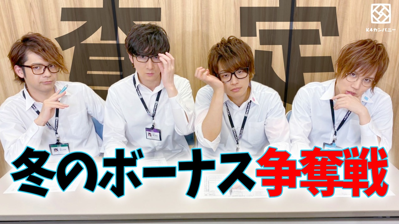 12月といえば冬のボーナス!<br>セカンドシーズンから今日に至るまで、1番K4カンパニーに貢献できた人は誰か、真剣査定のスタート!<br><br>■年賀状キャンペーン実施中<br>対象商品を1500円(税込み)以上まとめてお買い上げで、4人の直筆年賀状が届くキャンペーンを実施中!<br>期間:11月18日(月)12:00~2020年1月10日(金)23:59まで<br><br><a href="http://shop.nizista.com/c-fpage?fp=k4company">K4カンパニー社内販売</a><br><br>■CAFE de K4<br>コラボカフェ第2弾開店中!<br>●期間延長<br>池袋館 12/8まで!<br><br>●追加開催<br>池袋新館 12/6〜12/19<br>有楽町マルイ 12/6〜12/18<br>池袋マルイ1F(ドリンク)11/30〜12/12<br><br>詳細は<a href="http://pripricafe.com/cafe_de_k4/">コチラ</a><br><br>【K4カンパニーとは】<br>K4カンパニーは、創立メンバー4名(小松昌平、益山武明、増元拓也、濱健人)が会社(番組)を立ち上げ、ビッグな大企業にしていく!そんなサクセスストーリー番組です!<br><br>【K4カンパニー公式Twitter】<br>@shain_boshuchu( <a href="https://twitter.com/shain_boshuchu">https://twitter.com/shain_boshuchu </a>)<br>ぜひ入社(フォロー)して社員となり、応援をよろしくお願いします!<br><br>【オリジナルグッズ】<br><a href="http://shop.nizista.com/c-fpage?fp=k4company">社内販売</a><br><br>【関連リンク】<br>ニジ★スタ:<a href="https://nizista.com/">https://nizista.com/</a><br>ニジ★スタ編集部 公式Twitter:<a href="https://twitter.com/Nizista_jp">https://twitter.com/Nizista_jp</a><br>