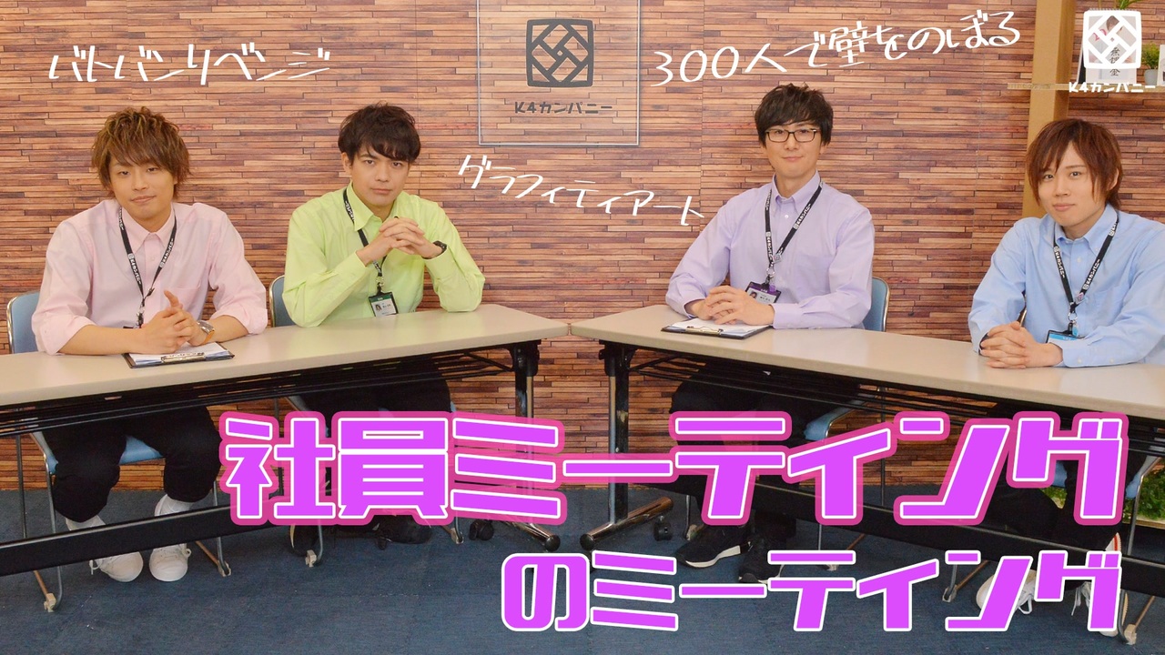 増元メインの社員ミーティングで何をやるのかをミーティング!<br>壁登り?ウォールアート?<br><br>※この動画の収録は自粛期間前にキャストスタッフの安全を考慮した上で行っています<br><br>♢♦♢♦お知らせ♦♢♦♢<br>生放送実施決定!<br>4/22(水)21時~<br>K4カンパニー「3rdシーズン戦略発表会~春~」<br>YouTubeLIVEとニコニコ生放送にて生放送が決定!<br>※詳細は随時K4カンパニー公式Twitterにてお知らせいたします<br><br>■第3回社員ミーティング開催決定!<br>出演:増元拓也、濱健人<br>日程:2020年6月21日(日)<br>(第一部)Open11:30/Start12:00<br>(第二部)Open15:30/Start16:00<br><br>会場:WITH HARAJUKU HALL<br><br>▽特設ページ<br><a href="https://nizista.com/views/article2?id=6ada4af082e111eaaf0627b6065526ea" target="_blank" rel="noopener nofollow">https://nizista.com/views/article2?id=6ada4af082e111eaaf0627b6065526ea</a><br><br><br>■「社員ご意見掲示板」復活!<br>ファーストシーズンで行っていた「社員ご意見掲示板」が復活!<br>配信内で定期的に頂いたご意見&ご質問にお答えしていきます!<br><br>▽専用フォームはこちら<br><a href="https://forms.gle/sPMm5oyqqRrfaRYB8" target="_blank" rel="noopener nofollow">https://forms.gle/sPMm5oyqqRrfaRYB8</a><br><br>【K4カンパニーとは】<br>K4カンパニーは、創立メンバー4名(小松昌平、益山武明、増元拓也、濱健人)が会社(番組)を立ち上げ、ビッグな大企業にしていく!そんなサクセスストーリー番組です!<br><br>【K4カンパニー公式Twitter】<br>@shain_boshuchu( <a href="https://twitter.com/shain_boshuchu">https://twitter.com/shain_boshuchu </a>)<br>ぜひ入社(フォロー)して社員となり、応援をよろしくお願いします!<br><br>【オリジナルグッズ】<br><a href="http://shop.nizista.com/c-fpage?fp=k4company">社内販売</a><br><br>【関連リンク】<br>ニジ★スタ:<a href="https://nizista.com/">https://nizista.com/</a><br>ニジ★スタ編集部 公式Twitter:<a href="https://twitter.com/Nizista_jp">https://twitter.com/Nizista_jp</a><br>