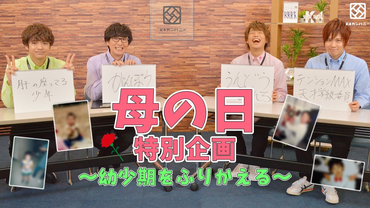 5/10は母の日ということで、幼少期を振り返り「お母さん、今はこんなに大きくなったよ」と感謝する特別企画をお届けします!<br><br>※この動画の収録は自粛期間前にキャストスタッフの安全を考慮した上で行っています<br><br>♢♦♢♦お知らせ♦♢♦♢<br>■公式アプリ「K4社内報」好評リリース中!<br>K4カンパニーの公式アプリが誕生しました!<br>アプリ限定動画やタイムライン等、オリジナルコンテンツ満載!<br><br>(情報)<br>K4カンパニ公式アプリ「K4社内報」<br>配信:スマートフォンアプリ (対応OS:Android / iOS)<br>価格:基本無料 ※月額有料会員サービス有(550円/月)<br><br>DLはこちらから↓<br><a href="https://c-rayon.com/k4company/" target="_blank" rel="noopener nofollow">https://c-rayon.com/k4company/</a><br><br>■「社員ご意見掲示板」復活!<br>ファーストシーズンで行っていた「社員ご意見掲示板」が復活!<br>配信内で定期的に頂いたご意見&ご質問にお答えしていきます!<br><br>▽専用フォームはこちら<br><a href="https://forms.gle/sPMm5oyqqRrfaRYB8" target="_blank" rel="noopener nofollow">https://forms.gle/sPMm5oyqqRrfaRYB8</a><br><br>【K4カンパニーとは】<br>K4カンパニーは、創立メンバー4名(小松昌平、益山武明、増元拓也、濱健人)が会社(番組)を立ち上げ、ビッグな大企業にしていく!そんなサクセスストーリー番組です!<br><br>【K4カンパニー公式Twitter】<br>@shain_boshuchu( <a href="https://twitter.com/shain_boshuchu">https://twitter.com/shain_boshuchu </a>)<br>ぜひ入社(フォロー)して社員となり、応援をよろしくお願いします!<br><br>【オリジナルグッズ】<br><a href="http://shop.nizista.com/c-fpage?fp=k4company">社内販売</a><br><br>【関連リンク】<br>ニジ★スタ:<a href="https://nizista.com/">https://nizista.com/</a><br>ニジ★スタ編集部 公式Twitter:<a href="https://twitter.com/Nizista_jp">https://twitter.com/Nizista_jp</a><br>
