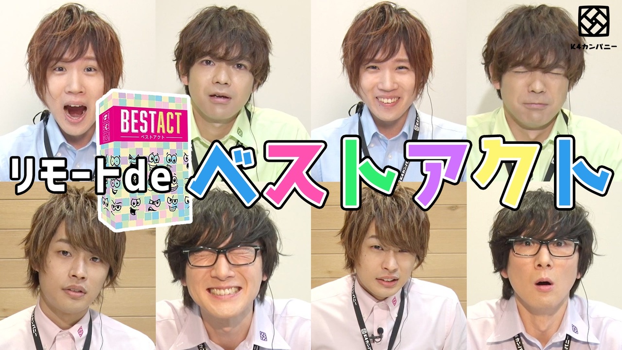 表情と声だけでお題を演じるボードゲーム『ベストアクト』に挑戦!<br>果たしてK4カンパニー1のベストアクトは誰だ…!<br><br>※この動画の収録はコロナウイルス感染拡大防止対策を徹底し、キャストスタッフの安全を考慮した上で行っています<br><br>♢♦♢♦お知らせ♦♢♦♢<br>■「3周年記念社員総会~夏だ!ライブだ!K4だ!~」開催決定<br><br>イベント概要<br>『3周年記念社員総会~夏だ!ライブだ!K4だ!~』<br>出演:小松昌平、益山武明、増元拓也、濱健人<br>日程:【Day1】2020年8月14日(金)<br> 【Day2】2020年8月15日(土)<br><br>詳細は<a href="https://nizista.com/views/article2?id=5b6874809ff711ea80ccbb79785dc1a4">イベント特設ページ</a>をご覧ください!<br><br>■公式アプリ「K4社内報」好評リリース中!<br>K4カンパニーの公式アプリが誕生しました!<br>アプリ限定動画やタイムライン等、オリジナルコンテンツ満載!<br><br>(情報)<br>K4カンパニ公式アプリ「K4社内報」<br>配信:スマートフォンアプリ (対応OS:Android / iOS)<br>価格:基本無料 ※月額有料会員サービス有(550円/月)<br><br>DLは<a href="https://c-rayon.com/k4company/">こちら</a>から<br><br>【K4カンパニーとは】<br>K4カンパニーは、創立メンバー4名(小松昌平、益山武明、増元拓也、濱健人)が会社(番組)を立ち上げ、ビッグな大企業にしていく!そんなサクセスストーリー番組です!<br><br>【K4カンパニー公式Twitter】<br>@shain_boshuchu( <a href="https://twitter.com/shain_boshuchu">https://twitter.com/shain_boshuchu </a>)<br>ぜひ入社(フォロー)して社員となり、応援をよろしくお願いします!<br><br>【オリジナルグッズ】<br><a href="http://shop.nizista.com/c-fpage?fp=k4company">社内販売</a><br><br>【関連リンク】<br>ニジ★スタ:<a href="https://nizista.com/">https://nizista.com/</a><br>ニジ★スタ編集部 公式Twitter:<a href="https://twitter.com/Nizista_jp">https://twitter.com/Nizista_jp</a><br>