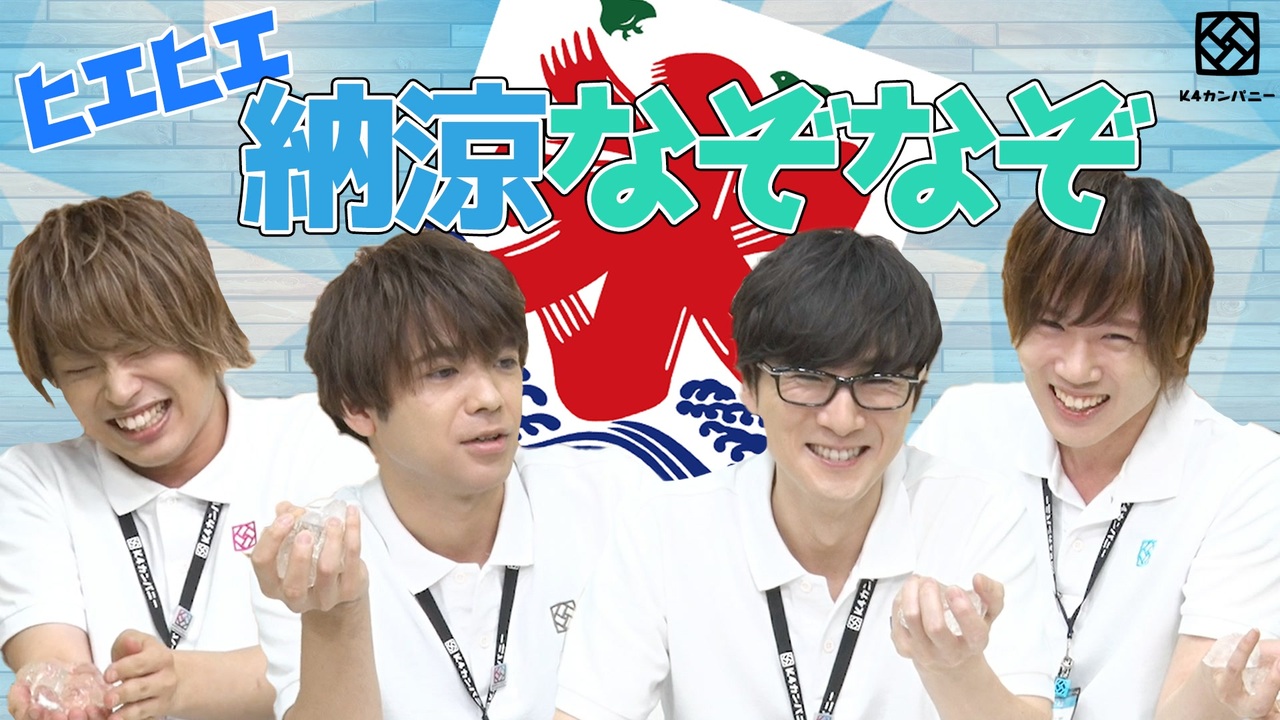猛暑が続く最近・・・<br>こんな時は「納涼なぞなぞ」で楽しく涼しくなろう!<br><br>※この動画の収録はコロナウイルス感染拡大防止対策を徹底し、キャストスタッフの安全を考慮した上で、7月下旬に行いました<br><br>♢♦♢♦お知らせ♦♢♦♢<br>■ベストアルバムリリース決定<br>K4カンパニー初のベストアルバム『Message』<br>2020年8月31日にリリース決定!!<br><br>↓公式オンラインショップ「Nizistore」にて好評予約販売中↓<br><a href="https://nizista.store/products/4589739791121" target="_blank" rel="noopener nofollow">https://nizista.store/products/4589739791121</a><br><br>▼収録曲「link」MV公開中<br><a href="https://youtu.be/H6YVvjKq3is" target="_blank" rel="noopener nofollow">https://youtu.be/H6YVvjKq3is</a><br><br>▼トレーラー公開中<br><a href="https://youtu.be/PTJhMTgIcAk" target="_blank" rel="noopener nofollow">https://youtu.be/PTJhMTgIcAk</a><br><br>▼リリースイベントも決定!詳細はコチラ<br><a href="https://nizista.com/views/article2?id=1cb5df80c24e11ea8450abc4a3b70d81" target="_blank" rel="noopener nofollow">https://nizista.com/views/article2?id=1cb5df80c24e11ea8450abc4a3b70d81</a><br><br><br>【K4カンパニーとは】<br>K4カンパニーは、創立メンバー4名(小松昌平、益山武明、増元拓也、濱健人)が会社(番組)を立ち上げ、ビッグな大企業にしていく!そんなサクセスストーリー番組です!<br><br>【K4カンパニー公式Twitter】<br>@shain_boshuchu( <a href="https://twitter.com/shain_boshuchu">https://twitter.com/shain_boshuchu </a>)<br>ぜひ入社(フォロー)して社員となり、応援をよろしくお願いします!<br><br>【オリジナルグッズ】<br><a href="http://shop.nizista.com/c-fpage?fp=k4company">社内販売</a><br><br>【関連リンク】<br>ニジ★スタ:<a href="https://nizista.com/">https://nizista.com/</a><br>ニジ★スタ編集部 公式Twitter:<a href="https://twitter.com/Nizista_jp">https://twitter.com/Nizista_jp</a><br>