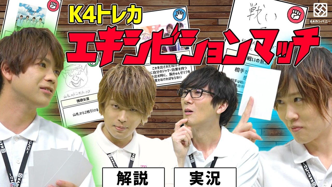 K4トレカ企画の続編!<br>社員さんのアイデア紹介&実際にエキシビションマッチで対戦!<br><br>※この動画の撮影はコロナウイルス感染拡大防止対策を徹底し、キャストスタッフの安全を考慮した上で行っています<br><br>♢♦♢♦お知らせ♦♢♦♢<br>■ベストアルバム好評発売中<br>K4カンパニー初のベストアルバム『Message』<br>2020年8月31日リリース!<br><br>公式オンラインショップ「Nizistore」にて好評予約販売中!<br><a href="https://nizista.store/products/4589739791121" target="_blank" rel="noopener nofollow">https://nizista.store/products/4589739791121</a><br><br>▼収録曲「link」MV公開中<br><a href="https://youtu.be/H6YVvjKq3is" target="_blank" rel="noopener nofollow">https://youtu.be/H6YVvjKq3is</a><br><br>▼トレーラー公開中<br><a href="https://youtu.be/PTJhMTgIcAk" target="_blank" rel="noopener nofollow">https://youtu.be/PTJhMTgIcAk</a><br><br><br>【K4カンパニーとは】<br>K4カンパニーは、創立メンバー4名(小松昌平、益山武明、増元拓也、濱健人)が会社(番組)を立ち上げ、ビッグな大企業にしていく!そんなサクセスストーリー番組です。<br>毎週月曜19時に配信中!<br><br>【K4カンパニー公式Twitter】<br>@shain_boshuchu( <a href="https://twitter.com/shain_boshuchu" target="_blank" rel="noopener nofollow">https://twitter.com/shain_boshuchu</a> )<br>ぜひ入社(フォロー)して社員となり、応援をよろしくお願いします!<br><br>【公式ECショップ(社内販売)】<br><a href="https://nizista.store/" target="_blank" rel="noopener nofollow">https://nizista.store/</a><br><br>【ニジスタ ch】<br>ニジスタが企画 or 提供する番組・動画コンテンツを随時アップロード!<br>ぜひチャンネル登録をお願いします。<br><a href="https://www.youtube.com/channel/UC2PRpKmHDXZ9KwpaF41TEnQ/featured" target="_blank" rel="noopener nofollow">https://www.youtube.com/channel/UC2PRpKmHDXZ9KwpaF41TEnQ/featured</a>