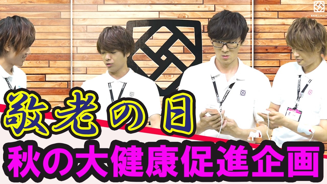 今日は敬老の日!<br>ご長寿目指して一同悶絶!!健康器具でミッションに挑戦します<br><br>※この動画の撮影はコロナウイルス感染拡大防止対策を徹底し、キャストスタッフの安全を考慮した上で行っています<br><br>♢♦♢♦お知らせ♦♢♦♢<br>■ベストアルバム好評発売中<br>K4カンパニー初のベストアルバム『Message』<br>2020年8月31日リリース!<br><br>公式オンラインショップ「Nizistore」にて好評販売中!<br><a href="https://nizista.store/products/4589739791121" target="_blank" rel="noopener nofollow">https://nizista.store/products/4589739791121</a><br><br>▼収録曲「link」MV公開中<br><a href="https://youtu.be/H6YVvjKq3is" target="_blank" rel="noopener nofollow">https://youtu.be/H6YVvjKq3is</a><br><br>▼トレーラー公開中<br><a href="https://youtu.be/PTJhMTgIcAk" target="_blank" rel="noopener nofollow">https://youtu.be/PTJhMTgIcAk</a><br><br><br>【K4カンパニーとは】<br>K4カンパニーは、創立メンバー4名(小松昌平、益山武明、増元拓也、濱健人)が会社(番組)を立ち上げ、ビッグな大企業にしていく!そんなサクセスストーリー番組です。<br>毎週月曜19時に配信中!<br><br>【K4カンパニー公式Twitter】<br>@shain_boshuchu( <a href="https://twitter.com/shain_boshuchu" target="_blank" rel="noopener nofollow">https://twitter.com/shain_boshuchu</a> )<br>ぜひ入社(フォロー)して社員となり、応援をよろしくお願いします!<br><br>【公式ECショップ(社内販売)】<br><a href="https://nizista.store/" target="_blank" rel="noopener nofollow">https://nizista.store/</a><br><br>【ニジスタ ch】<br>ニジスタが企画 or 提供する番組・動画コンテンツを随時アップロード!<br>ぜひチャンネル登録をお願いします。<br><a href="https://www.youtube.com/channel/UC2PRpKmHDXZ9KwpaF41TEnQ/featured" target="_blank" rel="noopener nofollow">https://www.youtube.com/channel/UC2PRpKmHDXZ9KwpaF41TEnQ/featured</a>