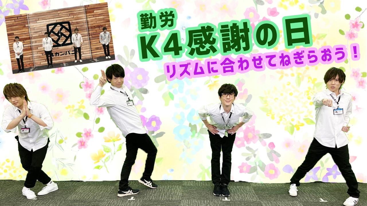 日頃の感謝を誉め言葉で!<br>リズムに合わせてK4らしい新しい勤労感謝の形を提案⁉<br><br>※この動画の撮影はコロナウイルス感染拡大防止対策を徹底し、キャストスタッフの安全を考慮した上で行っています<br>※動画内の「お知らせ」コーナーにて【第3・4回合同社員ミーティング】チケット販売開始時間に誤りがございました。<br>正しくは【11月27日(金)18:00~】となっております。<br>お詫びして訂正いたします。<br><br>♢♦♢♦お知らせ♦♢♦♢<br><br>■K4カンパニーTHE MOVIE~あの日のダンボール~特設サイト<br> <a href="https://k4company.jp/the_movie" target="_blank" rel="noopener nofollow">https://k4company.jp/the_movie</a><br><br> 公開に先駆けて映画応援グッズ好評予約販売中!<br> ▽詳細はこちら<br> <a href="https://nizista.store/collections/k4themovie1" target="_blank" rel="noopener nofollow">https://nizista.store/collections/k4themovie1</a><br><br>■ベストアルバムヒット記念!「link」スペシャルブロマイドセット販売中!<br>▽詳細はこちらからチェック▽<br><a href="https://nizista.store/products/4589739791640" target="_blank" rel="noopener nofollow">https://nizista.store/products/4589739791640</a><br><br>■ベストアルバム好評発売中<br>K4カンパニー初のベストアルバム『Message』<br>2020年8月31日リリース!<br><br>公式オンラインショップ「Nizistore」にて好評販売中!<br><a href="https://nizista.store/products/4589739791121" target="_blank" rel="noopener nofollow">https://nizista.store/products/4589739791121</a><br><br>▼収録曲「link」MV公開中<br><a href="https://youtu.be/H6YVvjKq3is" target="_blank" rel="noopener nofollow">https://youtu.be/H6YVvjKq3is</a><br><br>▼トレーラー公開中<br><a href="https://youtu.be/PTJhMTgIcAk" target="_blank" rel="noopener nofollow">https://youtu.be/PTJhMTgIcAk</a><br><br><br>【K4カンパニーとは】<br>K4カンパニーは、創立メンバー4名(小松昌平、益山武明、増元拓也、濱健人)が会社(番組)を立ち上げ、ビッグな大企業にしていく!そんなサクセスストーリー番組です。<br>毎週月曜19時に配信中!<br><br>【K4カンパニー公式Twitter】<br>@shain_boshuchu( <a href="https://twitter.com/shain_boshuchu" target="_blank" rel="noopener nofollow">https://twitter.com/shain_boshuchu</a> )<br>ぜひ入社(フォロー)して社員となり、応援をよろしくお願いします!<br><br>【公式ECショップ(社内販売)】<br><a href="https://nizista.store/" target="_blank" rel="noopener nofollow">https://nizista.store/</a><br><br>【ニジスタ ch】<br>ニジスタが企画 or 提供する番組・動画コンテンツを随時アップロード!<br>ぜひチャンネル登録をお願いします。<br><a href="https://www.youtube.com/channel/UC2PRpKmHDXZ9KwpaF41TEnQ/featured" target="_blank" rel="noopener nofollow">https://www.youtube.com/channel/UC2PRpKmHDXZ9KwpaF41TEnQ/featured</a>