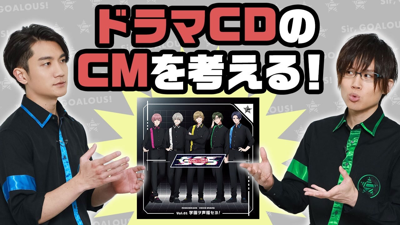 【GOALOUS5 ニコニコ動画支部】<br>3月発売のボイスドラマのCMを作る!(GO5チャンネル 第93回)<br><br>★2021年3月25日 MISSION:GO5 ボイスドラマVol.1「学園ヲ声福セヨ!」発売決定!<br>新規楽曲も収録決定!予約受付中!<br><GCRESTORE(ジークレストア)><br>CD:<a href="https://gcrest.store/products/gcp20210005g5" target="_blank" rel="noopener nofollow">https://gcrest.store/products/gcp20210005g5</a><br>M∞CARD A、B:<a href="https://gcrest.store/products/gcp20210006g5" target="_blank" rel="noopener nofollow">https://gcrest.store/products/gcp20210006g5</a><br><アニメイト(通販含む全店舗)><br>CD:animate-onlineshop.jp/pn/pd/1902125/<br>M∞CARD A:<a href="https://www.animate-onlineshop.jp/pn/pd/1902126/" target="_blank" rel="noopener nofollow">https://www.animate-onlineshop.jp/pn/pd/1902126/</a><br>M∞CARD B:<a href="https://www.animate-onlineshop.jp/pn/pd/1902127/" target="_blank" rel="noopener nofollow">https://www.animate-onlineshop.jp/pn/pd/1902127/</a><br>※店舗別購入特典もあります<br><br>★ボイスドラマのイラストを使用した新グッズも予約受付中!<br>GCRESTORE(ジークレストア):<a href="https://gcrest.store/collections/goalous5" target="_blank" rel="noopener nofollow">https://gcrest.store/collections/goalous5</a><br><br>★テーマソングCD第2弾 <i>GOALOUS5「5 AHEAD!」</i>11月25日発売!<br>①販売店情報<br><GCRESTORE(ジークレストア)><br>MV盤(CD+DVD):<a href="https://gcrest.store/products/gcp20200038g5" target="_blank" rel="noopener nofollow">https://gcrest.store/products/gcp20200038g5</a><br>M∞CARD A、B:<a href="https://gcrest.store/products/gcp20200034g5" target="_blank" rel="noopener nofollow">https://gcrest.store/products/gcp20200034g5</a><br><アニメイト(通販含む全店舗)><br>MV盤(CD+DVD):<a href="https://www.animate-onlineshop.jp/pn/pd/1859037/" target="_blank" rel="noopener nofollow">https://www.animate-onlineshop.jp/pn/pd/1859037/</a><br>M∞CARD A:<a href="https://www.animate-onlineshop.jp/pn/pd/1859038/" target="_blank" rel="noopener nofollow">https://www.animate-onlineshop.jp/pn/pd/1859038/</a><br>M∞CARD B:<a href="https://www.animate-onlineshop.jp/pn/pd/1859039/" target="_blank" rel="noopener nofollow">https://www.animate-onlineshop.jp/pn/pd/1859039/</a><br>※店舗別特典もあります<br><br>②収録内容<br>試聴動画:<a href="https://youtu.be/3r6M5AywavQ" target="_blank" rel="noopener nofollow">https://youtu.be/3r6M5AywavQ</a><br>【MV盤】<br><収録曲><br>M01:5 AHEAD!<br>M02:RosyBeat<br>M03:5 AHEAD!(Instrumental)<br>M04:RosyBeat(Instrumental)<br><DVD映像収録内容><br>01:5 AHEAD! Music Video<br>02:5 AHEAD! Music Videoメイキング映像(MV盤映像特典)<br>03:Trailer<br>GCGC-0003/¥2,000(税抜)【M∞CARD A】<br><収録曲><br>M01:5 AHEAD!<br>M02:RosyBeat<br>M03:5 AHEAD!(Instrumental)<br>M04:RosyBeat(Instrumental)<br>+「RosyBeat」各メンバーのソロセリフVer.<br><収録映像><br>5 AHEAD! Music Video<br>GCGC-0004/¥1,700(税抜)【M∞CARD B】<br><収録曲><br>M01:5 AHEAD!<br>M02:RosyBeat<br>M03:5 AHEAD!(Instrumental)<br>M04:RosyBeat(Instrumental)<br><br>③購入特典<br><MV盤(CD+DVD)店舗別購入特典><br>GCRESTORE(ジークレストア):2L判ブロマイド<br>アニメイトオンライン:L判ブロマイド<br><M∞CARD A、B 店舗共通購入特典><br>複製直筆コメントが入ったM∞CARDが飾れるスタンドPOP 1種(ランダム全5種)<br>※ジークレストア、アニメイト共通の特典となります<br>※M∞CARD A、B共通で全5種となります<br><br>★悪の相談募集中<br>下記のフォームに記入、投稿をお願いいたします。<br><a href="http://bit.ly/2Q3wMUh" target="_blank" rel="noopener nofollow">http://bit.ly/2Q3wMUh</a><br><br>★GOALOUS5(ゴーラスファイブ)とは<br>世界声福(征服)を目論む悪の組織が、先遣隊として声を生業にする熊谷健太郎、小松昌平、寺島惇太、仲村宗悟、深町寿成を派遣した。それが「GOALOUS5(ゴーラスファイブ)」だ。5人は声を武器に人々を虜にし、世界を声福(征服)していくための活動を行っていく。<br><br>★GOALOUS5の虜になった者は、公式Twitterのフォローを。<br><br>★GOALOUS5公式Twitter<br>@sir_goalous( <a href="https://twitter.com/sir_goalous" target="_blank" rel="noopener nofollow">https://twitter.com/sir_goalous</a> )<br><br><br>運営:株式会社ジークレスト<br><a href="https://www.gcrest.com/" target="_blank" rel="noopener nofollow">https://www.gcrest.com/</a>