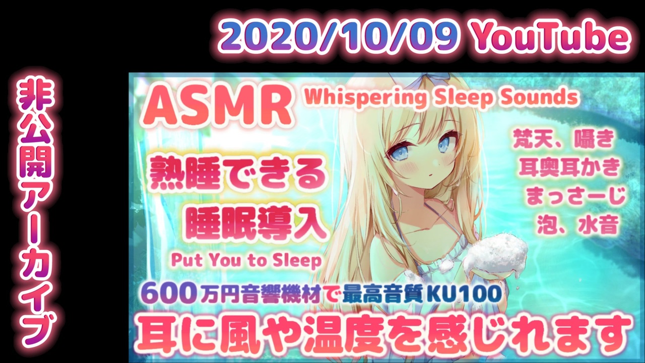 モバイルから見られない場合PCから視聴できます。<br>ファンティア開設しました。無料プランで写真見れるので登録してね!<a href="https://fantia.jp/rnqqU" target="_blank" rel="noopener nofollow">https://fantia.jp/rnqqU</a><br><span style="color: #ff0000; font-size: 16px;"><strong>会員限定動画を視聴するには、<br>チャンネル会員入会(月額500円)で視聴できます。<br>入会で過去動画も複数見放題です!<br>※プレミアム会員登録は不要です。</strong></span><br><span style="color: #9900ff; font-size: 16px;"><strong>入会はこちらから</strong></span><span style="font-size: 16px;"><strong><a href="https://secure.ch.nicovideo.jp/bylaw/ch2604516" target="_blank" rel="noopener nofollow">https://secure.ch.nicovideo.jp/bylaw/ch2604516</a></strong></span><br>ニコニコはYouTubeより高音質になっております。<br><span style="color: #38761d;"><strong>paypal連携で銀行口座、デビットカードやバンドルカードなど使えます</strong></span><br><br>Youtubeよりも高音質のASMR睡眠導入枠です。<br><span style="color: #ff00ff;"><strong>無料サンプル</strong></span>(こんな感じの放送でより高音質です)<a href="https://youtu.be/9m5IXO5_lMU" target="_blank" rel="noopener nofollow">https://youtu.be/9m5IXO5_lMU</a><br><span style="color: #0000ff;">睡眠枠月に1~2回、耳舐め枠月に2~3回<br>ニコニコchにて限定生放送しています</span><br><br>Youtubeで1時間以上の睡眠導入生放送を定期的にしています!<br>ニコニコに入会できない方はこちらでお楽しみください<br><span style="color: #ff0000;"><strong>※ニコニコの物の方が高音質です<br><a href="https://www.youtube.com/c/rnqqU" target="_blank" rel="noopener nofollow">https://www.youtube.com/c/rnqqU</a></strong></span><br><br>始めにニコニコの設定の広告設定はオフにしてご視聴ください(最初だけ音が鳴るかもしれません)<br>途中に広告などは入りません。<br><br><span style="color: #ff9900;"><strong>●タイムライン●</strong></span>(数字を押すとそこへ飛びます)<br>opening<a href="#" class="seekTime" data-seekTime="0:00" onclick="seekNicoPlayer('#0:00'); return false;">#0:00</a><br>ガラスの砂/glass sand<a href="#" class="seekTime" data-seekTime="1:05" onclick="seekNicoPlayer('#1:05'); return false;">#1:05</a><br><span style="color: #e69138;"><strong>【シャンプー/shampoo】</strong></span><br>水を掛け流す/water<a href="#" class="seekTime" data-seekTime="2:07" onclick="seekNicoPlayer('#2:07'); return false;">#2:07</a><br>髪をほぐす/blushing<a href="#" class="seekTime" data-seekTime="2:30" onclick="seekNicoPlayer('#2:30'); return false;">#2:30</a><br>トリートメントスプレー/treatment<a href="#" class="seekTime" data-seekTime="3:00" onclick="seekNicoPlayer('#3:00'); return false;">#3:00</a><br>頭皮マッサージ/massage<a href="#" class="seekTime" data-seekTime="3:35" onclick="seekNicoPlayer('#3:35'); return false;">#3:35</a><br>スクラブ炭酸泡/soda<a href="#" class="seekTime" data-seekTime="4:28" onclick="seekNicoPlayer('#4:28'); return false;">#4:28</a><br><span style="color: #e69138;"><strong>【耳のマッサージ/ear massage】</strong></span><br>泡マッサージ/foam<a href="#" class="seekTime" data-seekTime="6:25" onclick="seekNicoPlayer('#6:25'); return false;">#6:25</a><br>炭酸泡マッサージ/soda<a href="#" class="seekTime" data-seekTime="9:19" onclick="seekNicoPlayer('#9:19'); return false;">#9:19</a><br>泡保湿と耳ほぐし/foam massage<a href="#" class="seekTime" data-seekTime="12:39" onclick="seekNicoPlayer('#12:39'); return false;">#12:39</a><br>耳揉みこみ/finger pressure therapy<a href="#" class="seekTime" data-seekTime="14:52" onclick="seekNicoPlayer('#14:52'); return false;">#14:52</a><br>ホットジェルパック/gel massage<a href="#" class="seekTime" data-seekTime="15:26" onclick="seekNicoPlayer('#15:26'); return false;">#15:26</a><br>ひんやり水パック/water pack<a href="#" class="seekTime" data-seekTime="19:11" onclick="seekNicoPlayer('#19:11'); return false;">#19:11</a><br>耳のクーリングタイム/water sound<a href="#" class="seekTime" data-seekTime="20:09" onclick="seekNicoPlayer('#20:09'); return false;">#20:09</a><br>耳洗浄/water sound<a href="#" class="seekTime" data-seekTime="21:54" onclick="seekNicoPlayer('#21:54'); return false;">#21:54</a><br><span style="color: #e69138;"><strong>【耳掃除/ear cleaning】</strong></span><br>梵天で右耳掃除/fluffy ear pick<a href="#" class="seekTime" data-seekTime="22:35" onclick="seekNicoPlayer('#22:35'); return false;">#22:35</a><br>梵天で両耳掃除/fluffy ear pick<a href="#" class="seekTime" data-seekTime="23:23" onclick="seekNicoPlayer('#23:23'); return false;">#23:23</a><br>梵天で左耳掃除/fluffy ear pick<a href="#" class="seekTime" data-seekTime="25:28" onclick="seekNicoPlayer('#25:28'); return false;">#25:28</a><br>竹の耳かき/ear pick<a href="#" class="seekTime" data-seekTime="26:13" onclick="seekNicoPlayer('#26:13'); return false;">#26:13</a><br>綿棒で左耳掃除/cotton swab<a href="#" class="seekTime" data-seekTime="27:50" onclick="seekNicoPlayer('#27:50'); return false;">#27:50</a><br>右耳の奥を耳掃除/ear cleaning<a href="#" class="seekTime" data-seekTime="29:02" onclick="seekNicoPlayer('#29:02'); return false;">#29:02</a><br>左耳の奥を耳掃除/ear cleaning<a href="#" class="seekTime" data-seekTime="32:20" onclick="seekNicoPlayer('#32:20'); return false;">#32:20</a><br>指耳かき/ear cleaning<a href="#" class="seekTime" data-seekTime="35:32" onclick="seekNicoPlayer('#35:32'); return false;">#35:32</a><br>シリコンブラシの耳掃除/ear cleaning<a href="#" class="seekTime" data-seekTime="39:46" onclick="seekNicoPlayer('#39:46'); return false;">#39:46</a><br>刺激強め耳