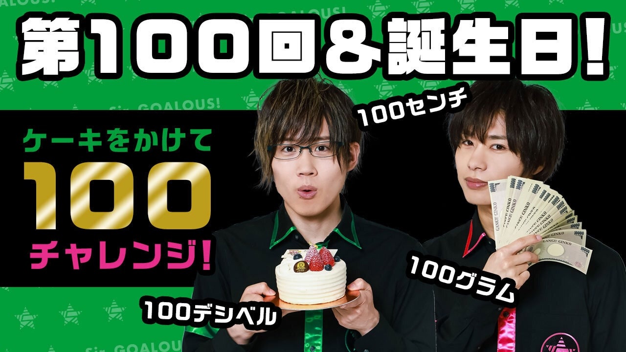 【GOALOUS5 ニコニコ動画支部】<br>100回記念&誕生日!ぴったり100を目指せチャレンジ!(GO5チャンネル 第100回)<br><br>★<strong>MISSION:GO5 ボイスドラマVol.1「学園ヲ声福セヨ!」</strong>発売中!<br>新規楽曲<strong>「HERE WE GO!」</strong>も収録!<br><GCRESTORE(ジークレストア)><br>CD:<a href="https://gcrest.store/products/gcp20210005g5" target="_blank" rel="noopener nofollow">https://gcrest.store/products/gcp20210005g5</a><br>M∞CARD A、B:<a href="https://gcrest.store/products/gcp20210006g5" target="_blank" rel="noopener nofollow">https://gcrest.store/products/gcp20210006g5</a><br><アニメイト(通販含む全店舗)><br>CD:animate-onlineshop.jp/pn/pd/1902125/<br>M∞CARD A:<a href="https://www.animate-onlineshop.jp/pn/pd/1902126/" target="_blank" rel="noopener nofollow">https://www.animate-onlineshop.jp/pn/pd/1902126/</a><br>M∞CARD B:<a href="https://www.animate-onlineshop.jp/pn/pd/1902127/" target="_blank" rel="noopener nofollow">https://www.animate-onlineshop.jp/pn/pd/1902127/</a><br>※店舗別購入特典もあります<br><br>★ボイスドラマのイラストを使用した新グッズも予約受付中!<br>GCRESTORE(ジークレストア):<a href="https://gcrest.store/collections/goalous5" target="_blank" rel="noopener nofollow">https://gcrest.store/collections/goalous5</a><br><br>★テーマソングCD第2弾 <strong>GOALOUS5「5 AHEAD!」</strong>11月25日発売!<br>①販売店情報<br><GCRESTORE(ジークレストア)><br>MV盤(CD+DVD):<a href="https://gcrest.store/products/gcp20200038g5" target="_blank" rel="noopener nofollow">https://gcrest.store/products/gcp20200038g5</a><br>M∞CARD A、B:<a href="https://gcrest.store/products/gcp20200034g5" target="_blank" rel="noopener nofollow">https://gcrest.store/products/gcp20200034g5</a><br><アニメイト(通販含む全店舗)><br>MV盤(CD+DVD):<a href="https://www.animate-onlineshop.jp/pn/pd/1859037/" target="_blank" rel="noopener nofollow">https://www.animate-onlineshop.jp/pn/pd/1859037/</a><br>M∞CARD A:<a href="https://www.animate-onlineshop.jp/pn/pd/1859038/" target="_blank" rel="noopener nofollow">https://www.animate-onlineshop.jp/pn/pd/1859038/</a><br>M∞CARD B:<a href="https://www.animate-onlineshop.jp/pn/pd/1859039/" target="_blank" rel="noopener nofollow">https://www.animate-onlineshop.jp/pn/pd/1859039/</a><br>※店舗別特典もあります<br><br>②収録内容<br>試聴動画:<a href="https://youtu.be/3r6M5AywavQ" target="_blank" rel="noopener nofollow">https://youtu.be/3r6M5AywavQ</a><br>【MV盤】<br><収録曲><br>M01:5 AHEAD!<br>M02:RosyBeat<br>M03:5 AHEAD!(Instrumental)<br>M04:RosyBeat(Instrumental)<br><DVD映像収録内容><br>01:5 AHEAD! Music Video<br>02:5 AHEAD! Music Videoメイキング映像(MV盤映像特典)<br>03:Trailer<br>GCGC-0003/¥2,000(税抜)【M∞CARD A】<br><収録曲><br>M01:5 AHEAD!<br>M02:RosyBeat<br>M03:5 AHEAD!(Instrumental)<br>M04:RosyBeat(Instrumental)<br>+「RosyBeat」各メンバーのソロセリフVer.<br><収録映像><br>5 AHEAD! Music Video<br>GCGC-0004/¥1,700(税抜)【M∞CARD B】<br><収録曲><br>M01:5 AHEAD!<br>M02:RosyBeat<br>M03:5 AHEAD!(Instrumental)<br>M04:RosyBeat(Instrumental)<br><br>③購入特典<br><MV盤(CD+DVD)店舗別購入特典><br>GCRESTORE(ジークレストア):2L判ブロマイド<br>アニメイトオンライン:L判ブロマイド<br><M∞CARD A、B 店舗共通購入特典><br>複製直筆コメントが入ったM∞CARDが飾れるスタンドPOP 1種(ランダム全5種)<br>※ジークレストア、アニメイト共通の特典となります<br>※M∞CARD A、B共通で全5種となります<br><br>★悪の相談募集中<br>下記のフォームに記入、投稿をお願いいたします。<br><a href="http://bit.ly/2Q3wMUh" target="_blank" rel="noopener nofollow">http://bit.ly/2Q3wMUh</a><br><br>★GOALOUS5(ゴーラスファイブ)とは<br>世界声福(征服)を目論む悪の組織が、先遣隊として声を生業にする熊谷健太郎、小松昌平、寺島惇太、仲村宗悟、深町寿成を派遣した。それが「GOALOUS5(ゴーラスファイブ)」だ。5人は声を武器に人々を虜にし、世界を声福(征服)していくための活動を行っていく。<br><br>★GOALOUS5の虜になった者は、公式Twitterのフォローを。<br><br>★GOALOUS5公式Twitter<br>@sir_goalous( <a href="https://twitter.com/sir_goalous" target="_blank" rel="noopener nofollow">https://twitter.com/sir_goalous</a> )<br><br><br>運営:株式会社ジークレスト<br><a href="https://www.gcrest.com/" target="_blank" rel="noopener nofollow">https://www.gcrest.com/</a>