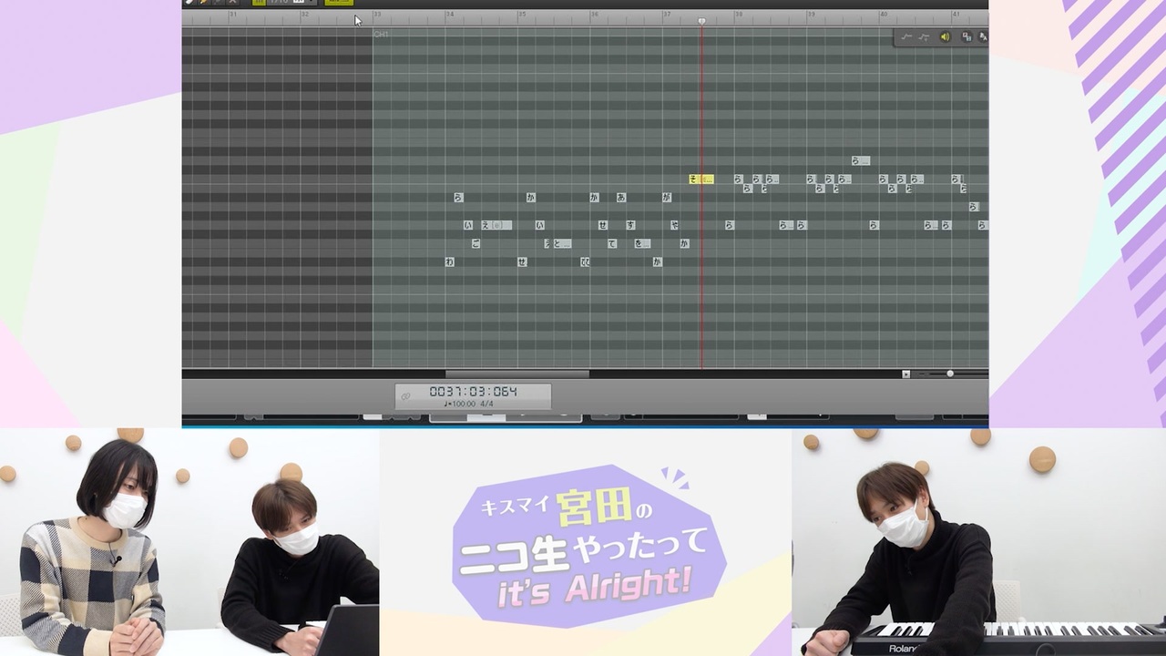 <br>゜+.――゜+.――゜+.――゜+.――゜+.――゜+.――゜+.――゜+.――゜+<br><br><strong>宮田ニキ</strong>でお馴染み!<br><strong>Kis-My-Ft2 宮田俊哉さん</strong>の月1ニコ生冠番組<br>「<span style="color: #9900ff;">キスマイ宮田のニコ生やったってit’s Alright!</span>」の企画としてお届けした<br><span style="color: #ff0000;">「VOCALOIDで楽曲制作シリーズ」</span>をお届け!<br><br>゜+.――゜+.――゜+.――゜+.――゜+.――゜+.――゜+.――゜+.――゜+<br><br>╭━━━━━━━━━━━╮<br> <strong><i>ボカロで楽曲制作!</i></strong><br>╰━━v━━━━━━━━╯<br><br>Kis-My-Ft2 宮田俊哉さんが<br><span style="color: #ff0000;">VOCALOIDで"番組テーマソング"を制作!</span><br>制作の様子を追っていきます!<br><br>今回は歌詞と花火の音を入れて行きます!<br><br><strong><a href="https://www.nicovideo.jp/watch/so41895240" target="_blank">#4-4</a></strong><strong> ← 前 次 → </strong><strong><a href="https://www.nicovideo.jp/watch/so41965316" target="_blank">#4-6</a></strong><br><br>完成をお楽しみに!・:*+.\(( °ω° ))/.:+<br><br><span style="color: #ff9900;"><strong>◆Special Thanks</strong></span><br> ●40mP 様<br> 公式サイト:<a href="https://www.40mp-official.com/" target="_blank">https://www.40mp-official.com/</a><br> Twitter:<a href="https://twitter.com/40mp" target="_blank">https://twitter.com/40mP</a><br><br>-----------------------------------------------------------------------------<br><br><span style="color: #c27ba0; font-size: 16px;"><strong><u>\\キスマイ宮田のニコ生やったってit’s Alright! //</u></strong></span><br><br>“あの頃”の気持ちに戻ってこれをやりたい!<br>“いま”気になっているあれについて知りたい! など...<br>Kis-My-Ft2宮田俊哉さんが視聴者の皆さんと一緒に、<br>色々なことを楽しみながら叶えていく青春タイムリープ系番組!<br>毎月1回、ニコニコ生放送にて絶賛放送中!( ´ ▽ ` )<br><br><span style="color: #9900ff;"><strong>◆リンク</strong></span><br> ●Twitter:<a href="https://twitter.com/kismiya_2525" target="_blank">https://twitter.com/kismiya_2525</a><br> ●番組ポータルページ:<a href="https://ch.nicovideo.jp/kmf2-miyata-ch" target="_blank">https://ch.nicovideo.jp/kmf2-miyata-ch</a><br><br>-------------------------------------------------------------------------------<br>