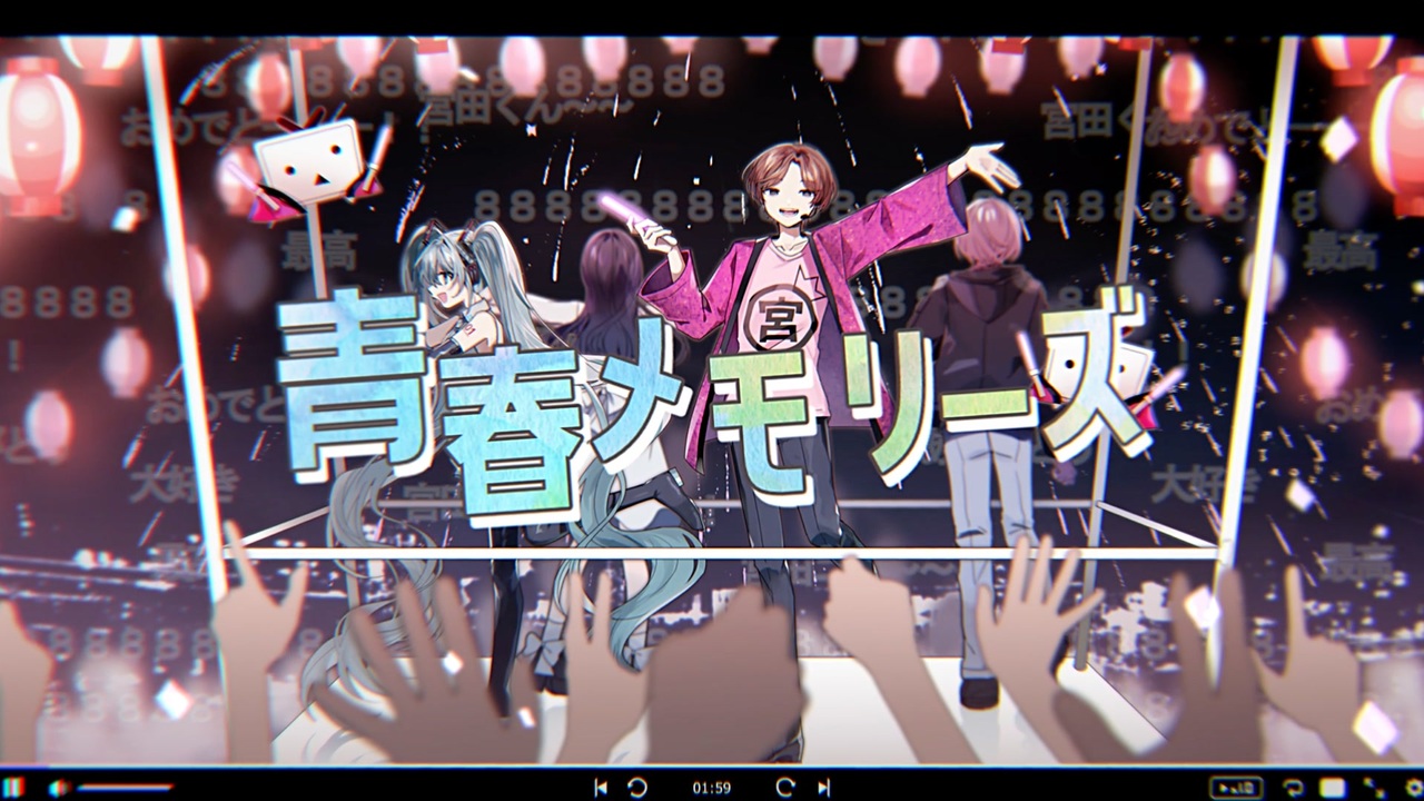 <br>゜+.――゜+.――゜+.――゜+.――゜+.――゜+.――゜+.――゜+.――゜+<br><br><strong>宮田ニキ</strong>でお馴染み!<br><strong>Kis-My-Ft2 宮田俊哉さん</strong>の月1ニコ生冠番組<br>「<span style="color: #9900ff;">キスマイ宮田のニコ生やったってit’s Alright!</span>」の番組テーマソング<br><span style="color: #0000ff;">「青春メモリーズ」</span><span style="color: #262626;">のMVをお届け!</span><br><br><br><span style="color: #ff9900; font-size: 18px;"><strong>ニコニコの花火上げちゃおう〜〜!!٩(ˊωˋ*)و✧*。</strong></span><br><br><br>゜+.――゜+.――゜+.――゜+.――゜+.――゜+.――゜+.――゜+.――゜+<br><br>◇music&lyric:あんみつ( = Kis-My-Ft2 宮田俊哉 )<br>◇vocal:初音ミク<br>◇illist:檀上大空(<a href="https:// https://twitter.com/skyw315" target="_blank"> https://twitter.com/skyw315</a> )<br>◇special thanks:40mP( <a href="https://twitter.com/40mp " target="_blank">https://twitter.com/40mP </a>)<br><br>-----------------------------------------------------------------------------<br><br>思い出したあの日の僕ら<br>同じ画面を見て何気ない日々だった<br>なれたのかな?想い描いた<br>大人になっていたり落ち着いているかな<br> <br>忘れてた?取り戻そう。<br>青春と夢とこれからを<br> <br>メソメソの日もションボリの日もココに集まって手を繋ごう<br>ドキドキしたりキラキラしたり好きな事だけ好きにしよう<br>ニコニコの花火上げちゃおう<br> <br>笑い声世界へと<br>響かせて明日を輝かそう<br> <br>クタクタな日もガッカリな日もココに集まって手を繋ごう<br>ワクワクしたりウキウキしたり好きなみんなとバカ騒ぎ<br>ニコニコの花火上げちゃおう!<br>ニコニコの花火上げちゃおう!!<br><br>-----------------------------------------------------------------------------<br><br><span style="color: #c27ba0; font-size: 16px;"><strong><u>\\キスマイ宮田のニコ生やったってit’s Alright! //</u></strong></span><br><br>“あの頃”の気持ちに戻ってこれをやりたい!<br>“いま”気になっているあれについて知りたい! など...<br>Kis-My-Ft2宮田俊哉さんが視聴者の皆さんと一緒に、<br>色々なことを楽しみながら叶えていく青春タイムリープ系番組!<br>毎月1回、ニコニコ生放送にて絶賛放送中!( ´ ▽ ` )<br><br><span style="color: #9900ff;"><strong>◆リンク</strong></span><br> ●Twitter:<a href="https://twitter.com/kismiya_2525" target="_blank">https://twitter.com/kismiya_2525</a><br> ●番組ポータルページ:<a href="https://ch.nicovideo.jp/kmf2-miyata-ch" target="_blank">https://ch.nicovideo.jp/kmf2-miyata-ch</a><br><br>-------------------------------------------------------------------------------<br>